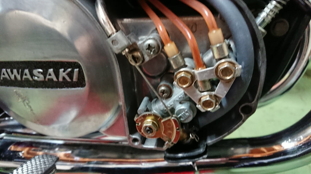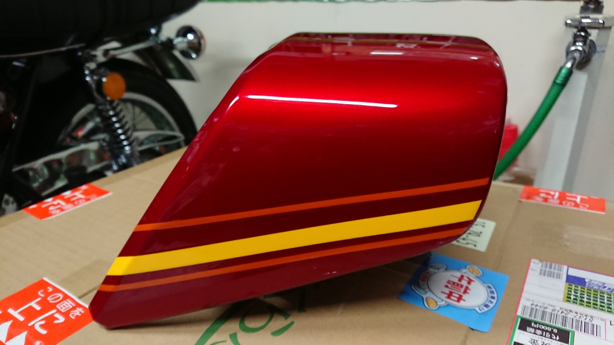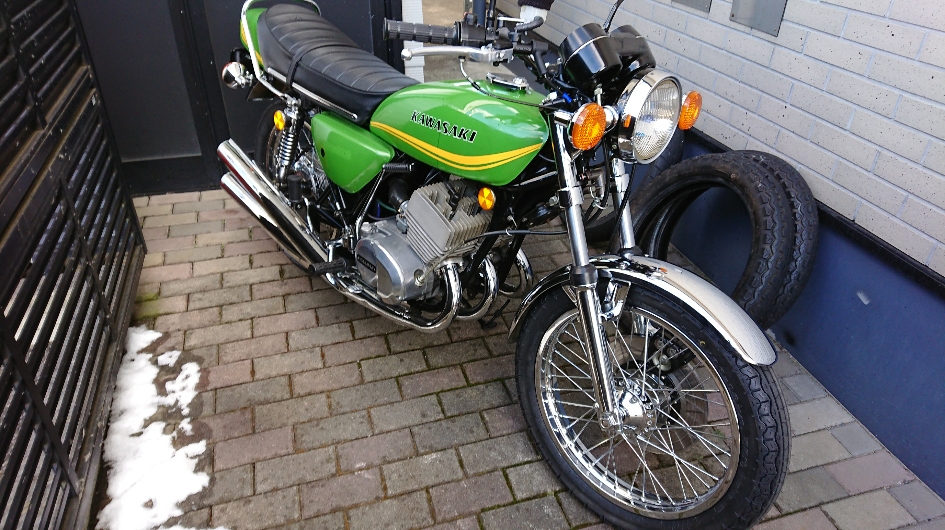 日常 2018/04/11 KH 完成?? こんにちは、CEOです<m(__)m>今年の冬はほんとに寒かったですねぇ.....その寒い中、KHのリビルドはなかなか思うように進みませんでしたが、4月に入り陽気が上がってきたのに伴い作業も進み、ようやく完成の域に達した感じですかね!(^^)!自分の手元に来た頃は年月に応じたヤレ感が漂っておりました。 ↑ 上の画像は磨きをかけた後なので、それなりに綺麗には見えますがイマイチ納得するレベルではありませんでした。で、前回言いましたようにタンク等外装とメーターケースの塗装、メーターのレストアを外注しておりました。どちらも1月末に発送し待つこと2ヶ月、ようやく完成し手元に戻ってきたのであります。先ずは、メーター。 これはレストア前です。それが↓ メーターケースに組んだ後ですが、その差は歴然!!!ある意味、新品以上のクオリティー(*´ω`*)素晴らしい仕事というほか、言葉が見つかりません!KHの年式も76年型ですので、あえてオドメーターの距離はそのままの状態でレストアして頂きました。そして外装関係。先ずはメーターケース タンク テールカウル サイドカバー とにかく、テッカテカのビッカビカ!!クオリティー、高すぎです(*´▽`*)他の部分が見劣りしてしまいます!これぞ職人技、プロの技術、テクニックであります。もう、惚れ惚れしてしまいますわ(*'ω'*)これを車体に組み込んでいくのですが、間違ってもキズなどつけないよう細心の注意をしながら作業しました。そして、完成です!! あぁぁ.....カッチョエェ~~~~~~(●´ω`●)ついに初期型KHへと40数年ぶりに戻りましたねぇ.....後は走行を重ねながら各部の調整をしていくところですが......さっそく気が付いてしまいました。KHというよりカワサキトリプルお約束のお漏らしを..... オイルポンプからのオイル漏れ.....( ;∀;)オイルポンプ自体がアルミの為、ネジ山をなめやすいらしいです(*_*;はたして、このKHはどうなっているのやら.....いずれにしてもオイル漏れは直さないといけないので、意を決して修理にかかりますぅ―((+_+))大丈夫な事を祈りつつ、又、次回<m(__)m> にほんブログ村[4回]