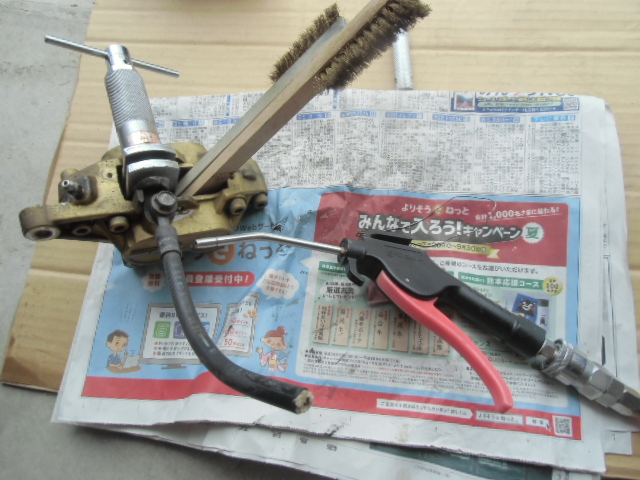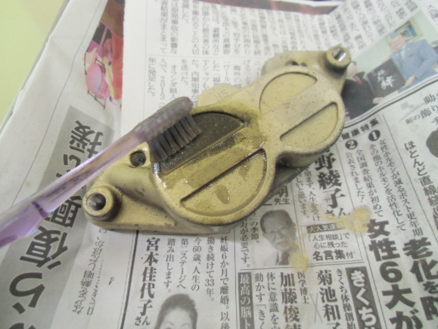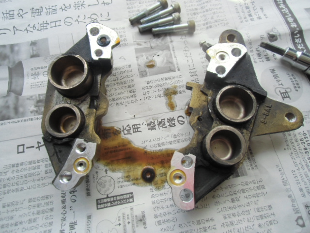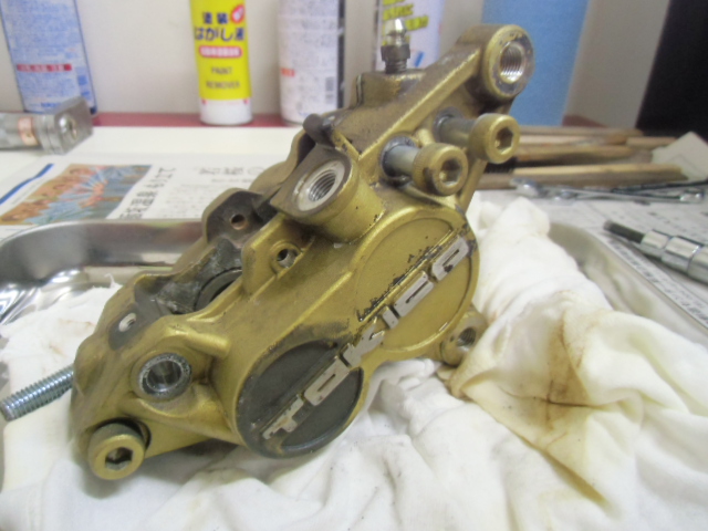 日常 2017/03/08 ガンマ F回りメンテ 其の1 こんにちは!マッシーです。只今、メンテナンス中のガンマ今はフロント回りを中心にメンテしております。これからしばらくは、貯め込んでいた写真をUPしていきます。 今現在もF回りバラバラの状態のガンマ今日はブレーキキャリパー編を書きます。 アクリル系塗料(自塗)で塗られていたキャリパー剥離して綺麗になればいいケド・・・・(-_-;) ピストンは当然固着!けど思ったよりヒストン表面の腐食は大丈夫そう? 廃材の純正ブレーキホースを取付、ホースにエアーを送り込みピストンを押し出す作戦!なるべく均一に押し出す為、木材などを入れ調整しましたが なかなか上手くいきませんでした (-_-;) トキコ製のキャリパーは、補修部品が全部でましたので迷わず割ります。 専用工具でピストンを引き抜きます! ピストンを外し中を確認すると、かなりゲロゲロな状態!頑張って磨きます!(=゚ω゚)ノ 料理用ようじで、キャリパーシールを取り外します。つまようじより丈夫です!木材なので表面に傷を付けずに取り外しが出来ます。又、シールの溝も気を使わずカリカリと汚れを削り落とせます。(=゚ω゚)ノ その他ケミカルなどを使い何とかここまで、頑張って綺麗にしました(=゚ω゚)ノ 表面の塗料は、歯ブラシにアクリル系溶剤を付け塗装を剥がします。 外したシール ブヨブヨしておらず再利用出来そうな感じですが、当然ながら新品に交換します。 普通の人が見ればただの輪っかのゴム?にしか見えない物がそれなりの値段します。(-_-;) シールに専用グリース(ヤマハ製)を塗り取付ます。 ピストンも思っていた以上に状態も良く、軽く磨く程度で綺麗になりました。ピストンの表面にもグリースを塗りはめ込んでいきます。 取付ボルトはホームセンターで購入した鉄黒ボルト1本 何十円でした。念の為ボルト仕様・強度も確認しました。多分大丈夫だと思いますが、すぐサビそうな気配・・・・(-_-;) 剥離したキャリパーの表面に、邪道ですが・・・・「ドライタイプのスプレーシリコングリース」を吹きかけるとツヤツヤした表面になりました。あまりおススメではないやり方ですが、とりあえずこれで様子をみます(-_-;) 外したブレーキパッド残量はありますが、漏れたフォークオイルを吸ってる感じなので コストパフォーマンスで評判の「プロジェクトμ」のエコスポーツブレーキパッドに交換しました! 純正ブレーキマスターシリンダー見た目は綺麗ですが、純正品を揃えO/Hするよりも・・・・ ASSY交換の方が安上がり?と思うのでデイトナ製を購入! 新しいブレーキパッドを取付 キャリパーO/H終了 (=゚ω゚)ノ今回人生初のダブルディスク車を所有した私同じパーツが2個あると、手間もパーツ代も2倍かかります(-_-;) にほんブログ村[4回]