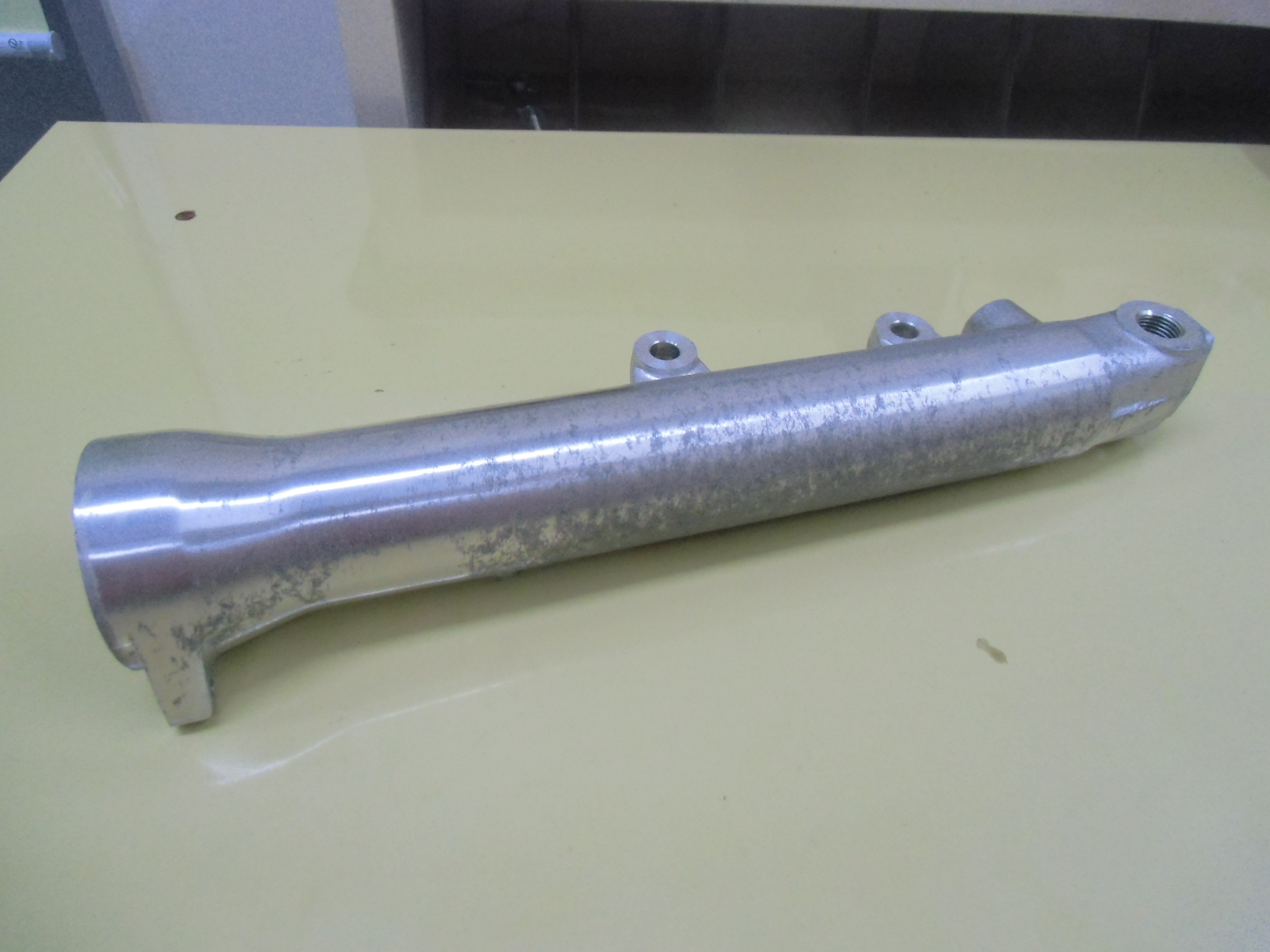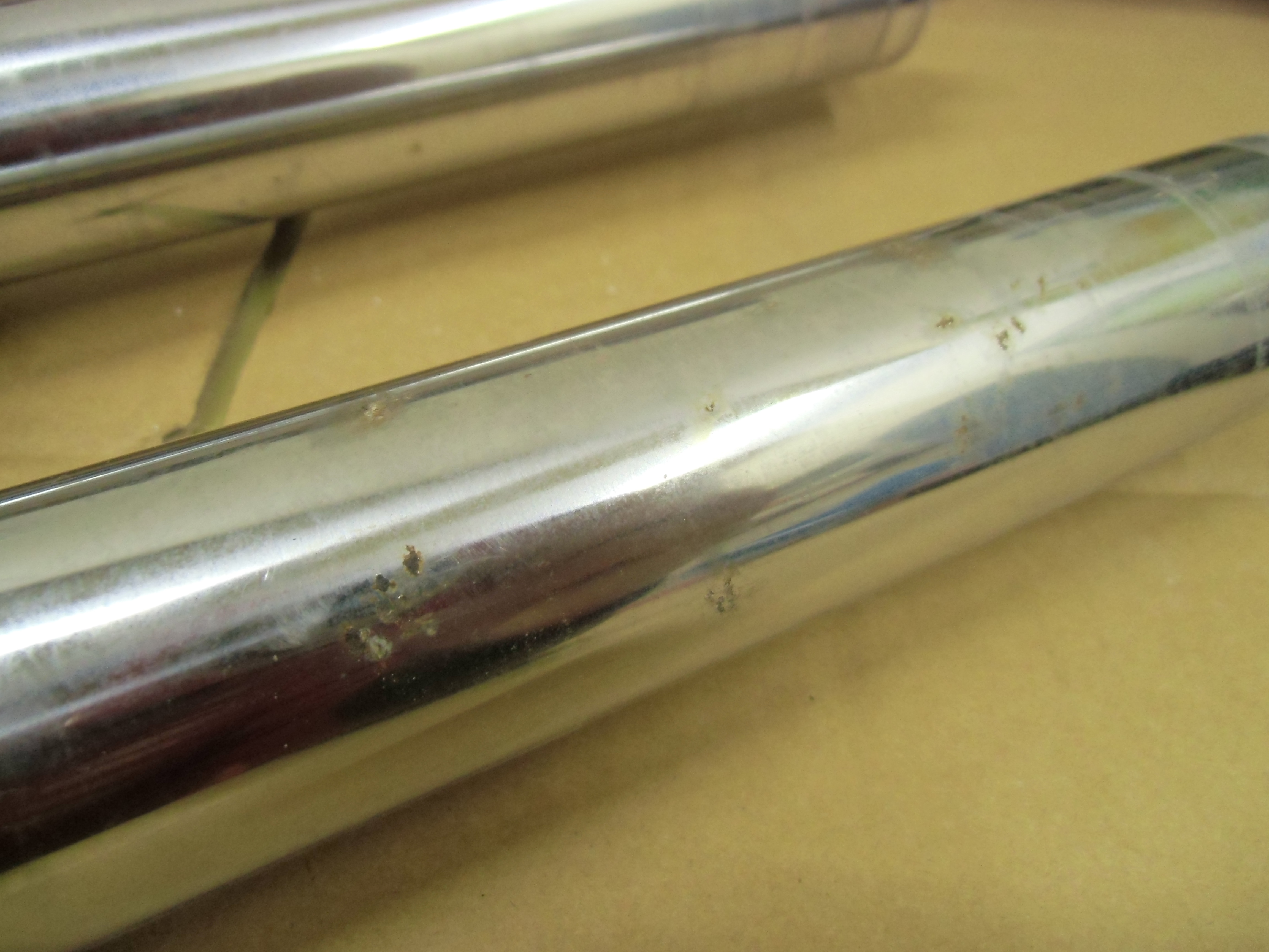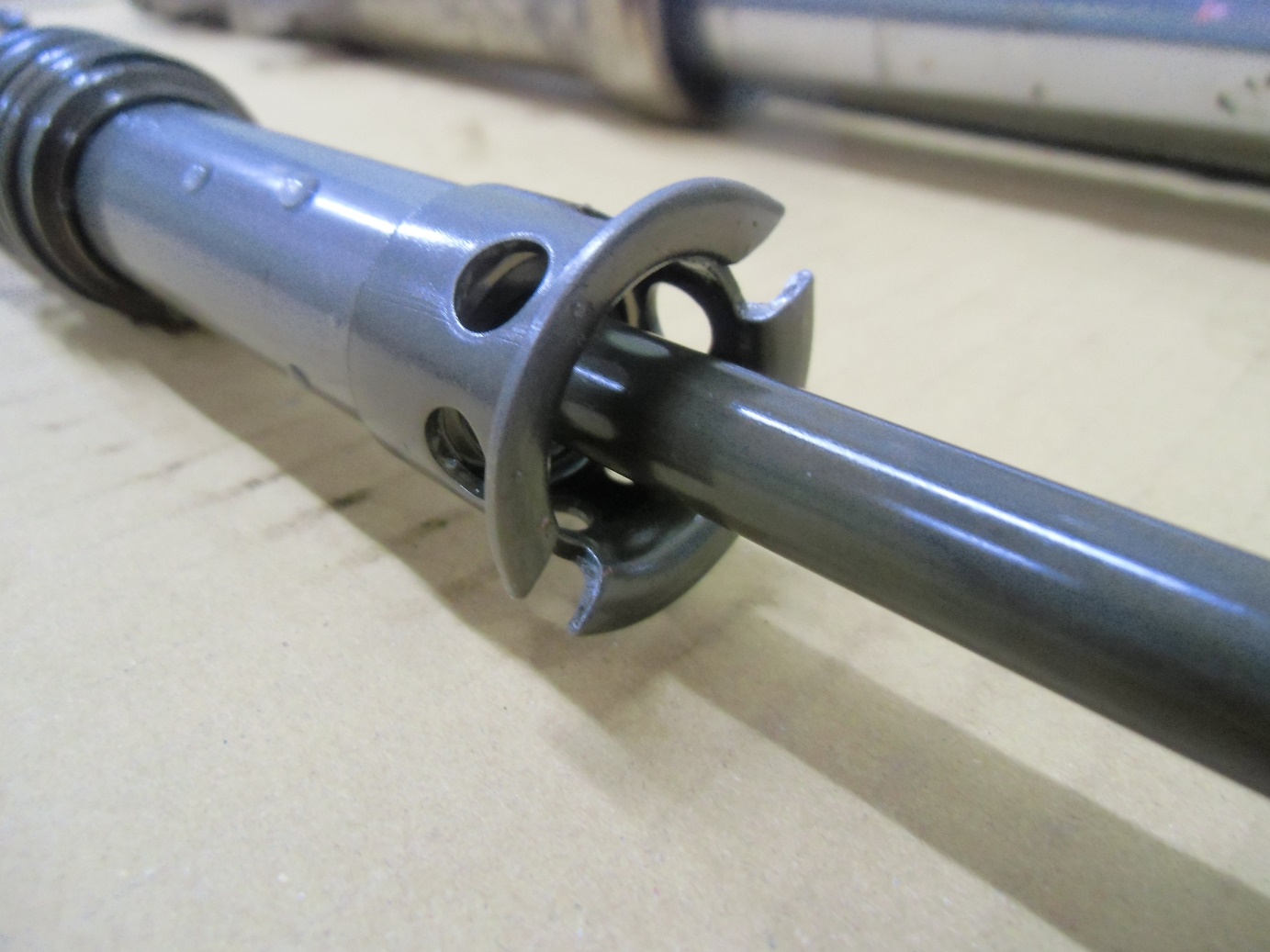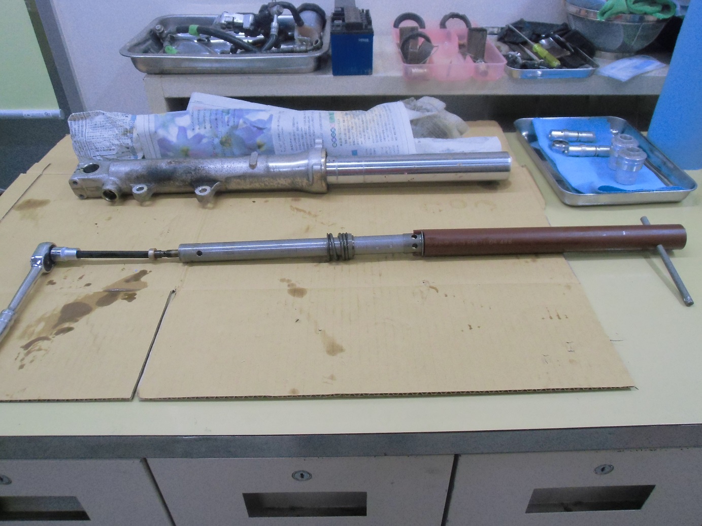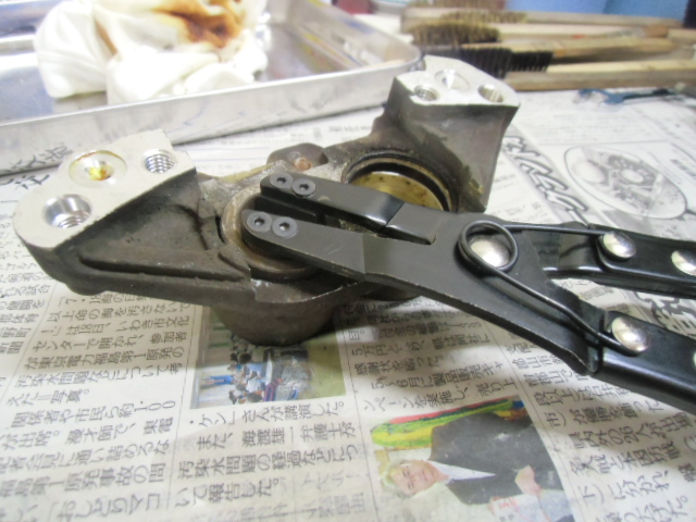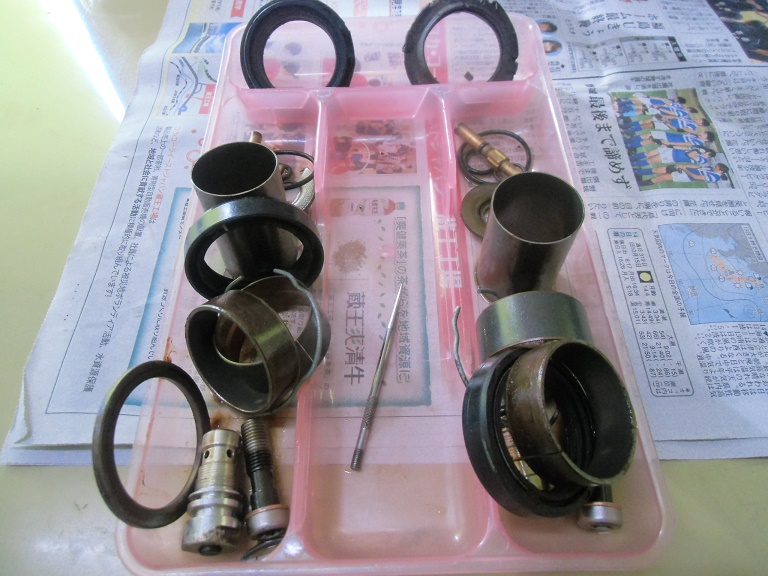 日常 2017/03/10 ガンマ F回りメンテ 其の3 こんにちは!マッシーです。今日は、フロントフォーク編を書きます。 ガンマを引き上げに行った段階からダストシールはこんな状態 (;゚Д゚) インナーチューブも点サビが酷く、 爪で引っ掛かる位の箇所もあり当然ながらフォークオイルが漏れアウターチューブはこの有り様 (;゚Д゚)ま~どんな状態であれ、O/Hはしないといけないのですがなるべくお金をかけずに、けどかけるところはキッチリかけないといけないので、まずはバラシから始めます。(=゚ω゚)ノ トップキャップ緩めオイルを抜きます。以外に綺麗なオイルが出てきました。 トップキャップをばらし、スプリング等を抜き取ります。 SP仕様のフォークの為、通常とは違う特殊工具が無いとインナーロッドが外せなく、又特殊工具を買うお金を浮かす為塩ビパイプにて自作で作りました(=゚ω゚)ノ 上の写真は、インナーロッド 共回りするので・・・・ コの字溝に特殊工具を取付インナーロッドが回らないようにします。 下部の六角ネジを外します。 フォークの中はこんな仕組みになっています。何とか上手く外せました(=゚ω゚)ノ 純正パーツを外した順に並べ、各部チェック再利用可・不可を確認します。 今回O/Hに使う純正パーツ 欠品無し!全て出ました。流石スズキ!助かりますヽ(^。^)ノ アウターチューブは、剥離剤でクリア塗装を剥がします。 オイル汚れも一緒に取れ綺麗になりましたが、 アルミ腐食が酷いので・・・・・ ガムテープで穴の箇所をマスキングし 知人の所へ持って行きガラスビーズにてブラストをしてもらいました。その後は、忍耐あるのみの (-_-;)サンドペーパーによる「手バフ」を実施!最後にマザーズを使いポリッシュ! いい感じに仕上がりました(=゚ω゚)ノ トップキャップもバフ掛けしました。この作業する前に、インナーチューブは再利用不可 (-_-;) なので、再メッキする為、「株東洋硬化」様へ送りました。納期は3~4週間ほどかかる予定そしてついに明日自宅に届きますヽ(^。^)ノこのつづきは後日・・・・明日は、東日本大震災から6年となります。今こうして普通にバイクに乗りバイクをいじり楽しめる日に改めて感謝いつまでもみんなが楽しめる日々が、送れるよう願いたいです。 にほんブログ村[1回]PR