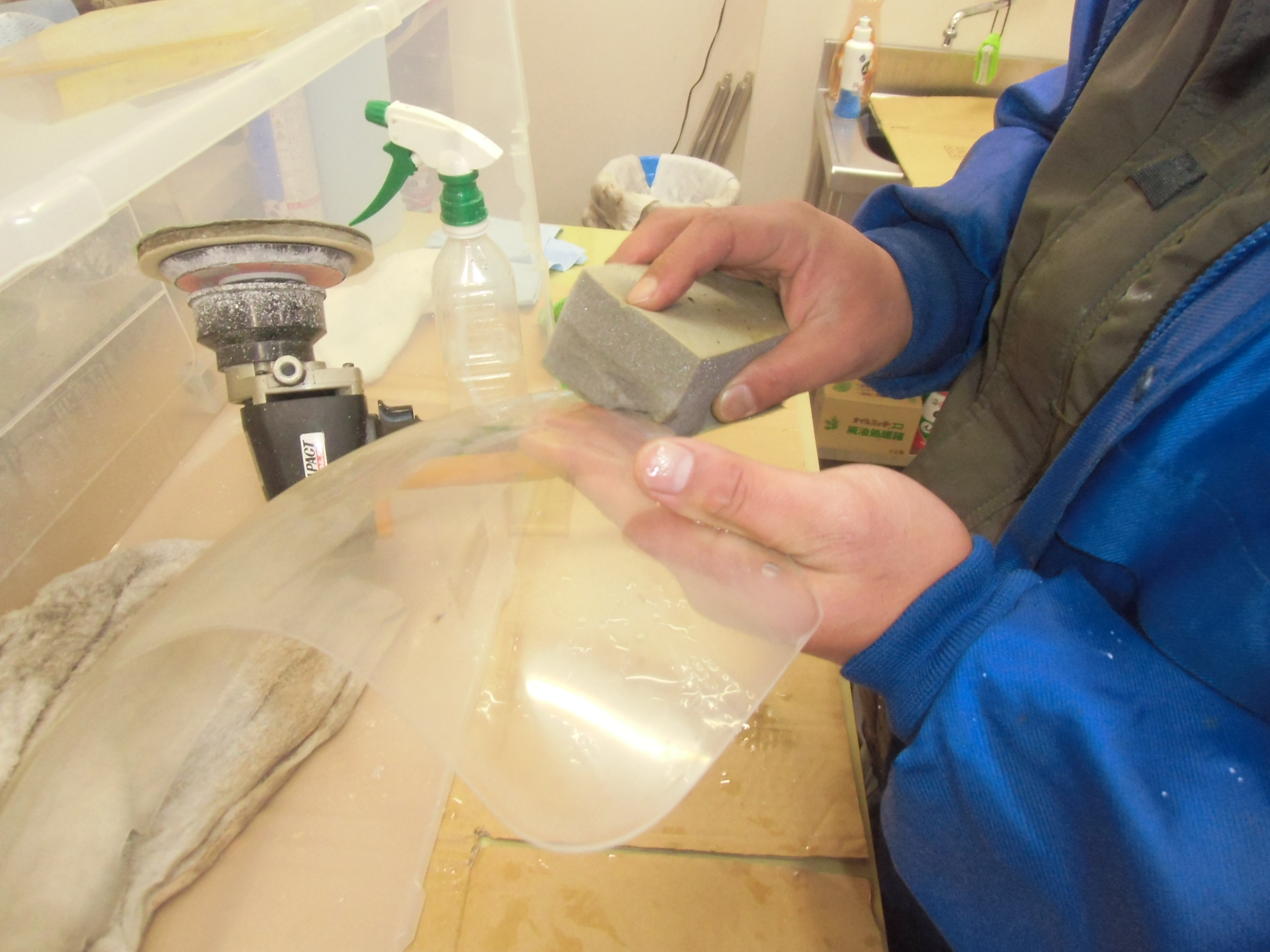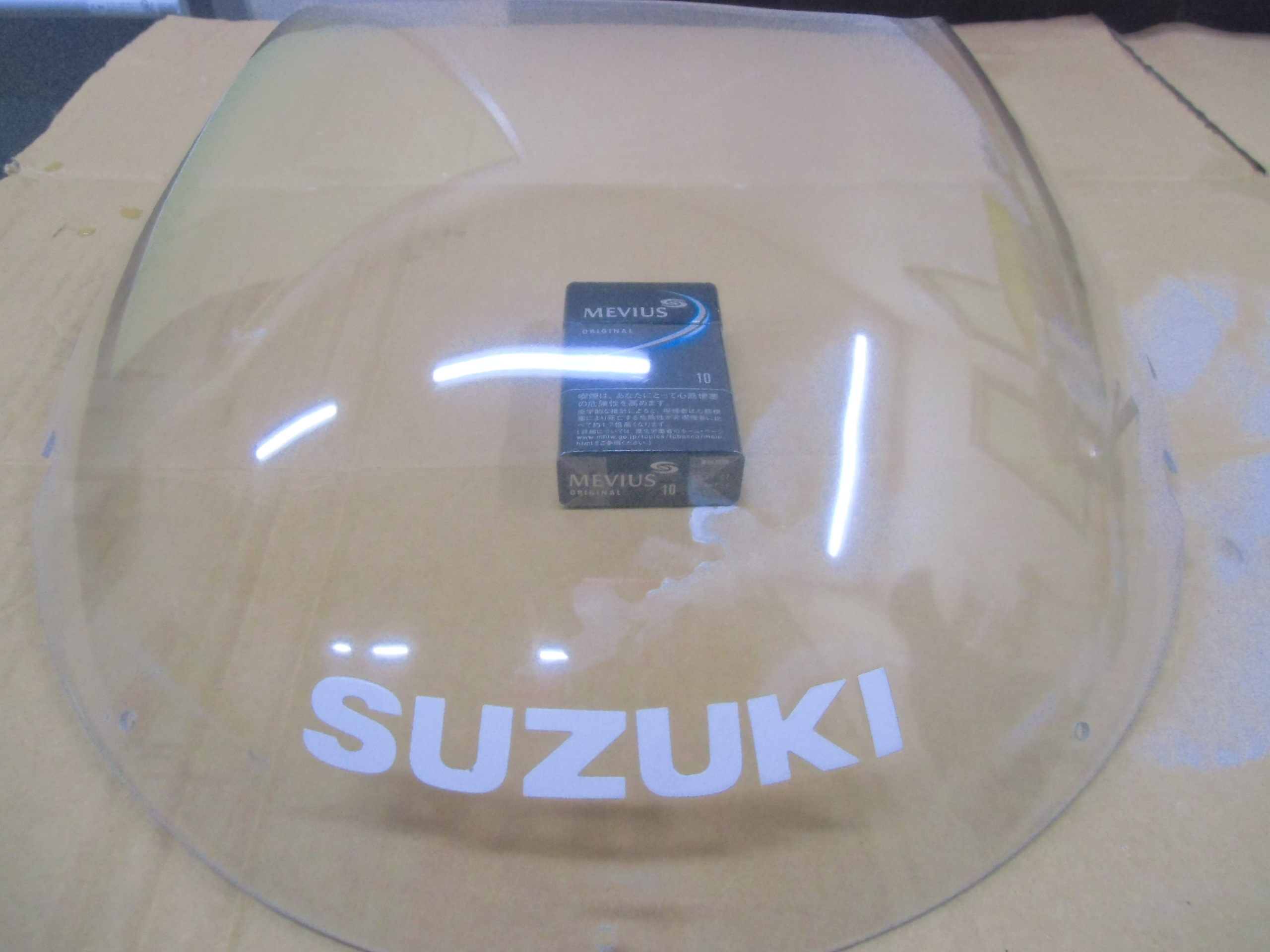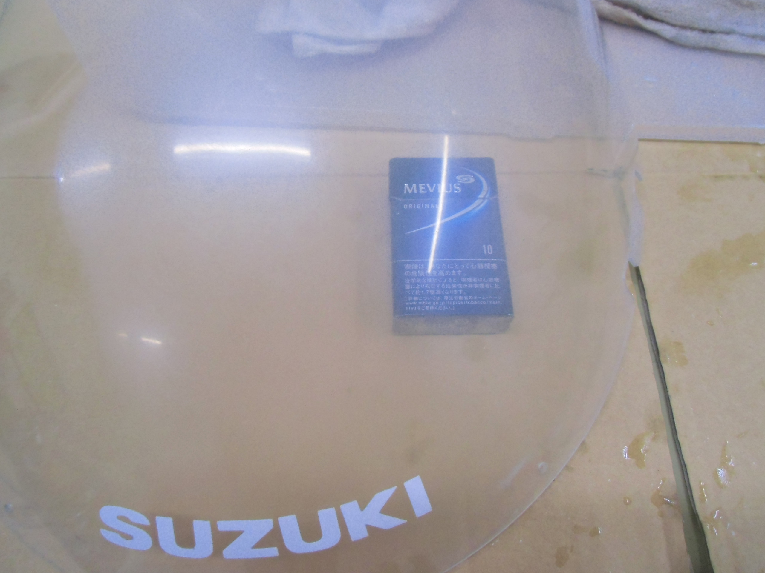 日常 2017/03/09 ガンマ F回りメンテ 其の2 こんにちは!マッシーです。今日はスクリーン編を書きます。(=゚ω゚)ノ 何十年と室内保管されていたとはいえ、完全に劣化?の影響で真っ白に曇っているスクリーン ※たばこの箱を置いて見てみると曇って見えません(-_-;)果たして復活するのでしょうか? 知人の磨きのプロに作業してもらいました。まずは極細研磨シート(使い古しがいいみたいです)と水でポリッシュします。「劣化しているのは表側だけなので、裏面は研磨しない!」のが、秘訣だそうです。 かなり水が飛ぶので、クリアケースの中で作業! 切り込みが入っている所は、均一に研磨出来ないので、専用研磨スポンジでポリッシュ! 水のみのポリッシュでここまで綺麗になりました。少したばこの箱が見えやすくなりました(=゚ω゚)ノ 次にスポンジを取付け、専用ケミカルで磨きます。 裏面も磨きます(=゚ω゚)ノ磨き終えたスクリーンを専用のウエスで拭きあげると・・・・・ ここまで透明感が復活(=゚ω゚)ノ やっぱりプロの方は凄い (;゚Д゚) 早速カウルに取付ました 。ついでにカウルも磨いてもらいました。ツヤが復活していい感じです!今回の作業工賃は、「缶コーヒー」と「肉まん」(-。-)y-゜゜゜いつもありがとうございます (>_<) にほんブログ村[2回]