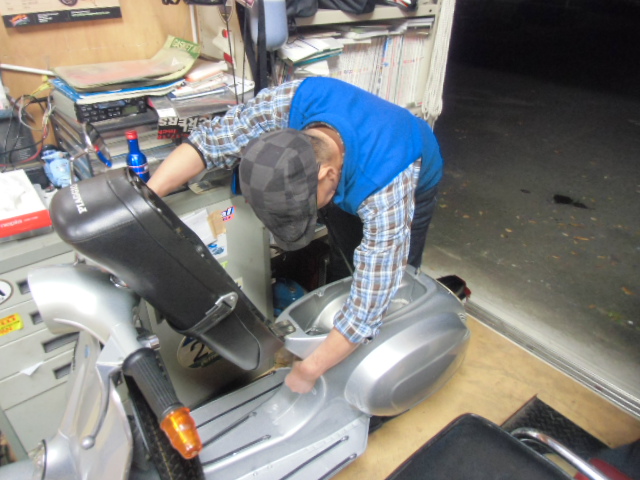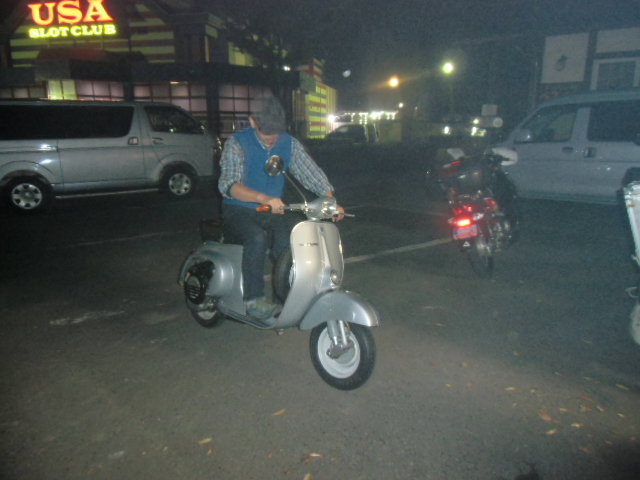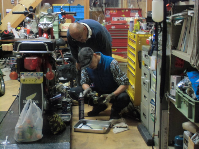 日常 2016/10/26 その道の方々・・・其の② こんにちは!マッシーです。前回の続き・・・グリーンワールドを後にし、一旦自宅へ帰りました。その日の午後16:00に知人と一緒にバイクを積んだ車に乗り込み 向かった先は・・・・須賀川市にある手作りパンの店「ベスパン」 到着時刻17:00 写真のベスパは、実働から約3年室内保管されていたいました。知人は以前から「ベスパ」を探していたのですが、なかなか希望の車両が見つからずかれこれ1年位経過しておりました。そんな中、私のバイク仲間を通じて極上のベスパを格安で売るとの情報をいただき無事商談成立!念願のベスパオーナーとなったのですが、私もオーナーの知人も全くベスパに関しては無知の2人 (-_-;)頼れるバイク屋さんも無い為、購入前にベスパンの矢吹さんに連絡をし、購入後、色々と「お世話をお願いいたします」と保険をかけていた私 (-_-;)そんなメンドクサイ事を、快く引き受けて下さいました矢吹さんに感謝です。 (*'▽') 先ずは、プラグを外し「火花」チェック! 特に問題なし (-。-)y-゜゜゜ ガソリンタンクを外し「キャブレター」の確認 実にスピーディーな作業でキャブ本体を外し「バラシ」始めた矢吹さん! キャブ本体は特に目立った汚れは無かったのですが、 「ジェット類」は腐ったガソリン等で詰まっていました。(-_-;)ケミカルを吹き付けしばし「ドブ漬け」にしておきます。 その間、キャブ本体 各部チェック!ずっと側で、真剣に矢吹さんの作業を見つめる知人・・・(; ・`д・´) 作業開始から約30分経過・・・ すっかり外は真っ暗! 「ドブ漬け」したジェット類にケミカルを吹き付け詰まった穴を貫通させます。 キャブを取付て 専用容器で「混合ガソリン」を作り 「点滴」に混合ガソリンを入れ直接キャブに流し入れます。 キャブのチョークを引いて・・・ スタンドの下に板を置き、リアタイヤを浮かせます。 待ちに待った「火入れ式」 数回キックペダルを踏むと・・・・ エンジンが目覚めました ( ゚Д゚) 一瞬にてガレージ内は「白煙」で真っ白に・・・・(*´Д`)「とりあえずひと安心」と思った矢先・・・・ エンジンはすこぶる調子良さげですが、チョークを戻すとエンジンがストールして止まります。やはり!キチンとしたキャブ調整が必要見たいです。(-_-;)これまでの作業にかかった時間は約1時間 ( ゚Д゚) 早っ!!!!!!矢吹さん!大変お世話になりました <m(__)m>その後、矢吹さんから「ベスパ」に関する色々な情報を教えてもらい帰り間際には、矢吹さんから古いベスパのエンブレムをプレゼントされ「とても充実した時間を過ごした!」と上機嫌な知人!私も大変色々と勉強になった楽しい1日でした。近頃朝晩は冷え込む為いよいよガレージにストーブを出す季節となりました。 ついでに鍋にサビ取り剤と「錆びたガンマのパーツ」を入れ煮込みます。ガンマレストアから2年目の「冬」となります。私の「ガンマ」は何時目覚める事やら~ (-。-)y-゜゜゜ にほんブログ村[4回]