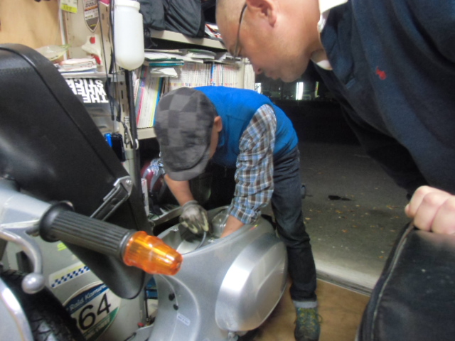 日常 2016/10/26 その道の方々・・・其の② こんにちは!マッシーです。前回の続き・・・グリーンワールドを後にし、一旦自宅へ帰りました。その日の午後16:00に知人と一緒にバイクを積んだ車に乗り込み 向かった先は・・・・須賀川市にある手作りパンの店「ベスパン」 到着時刻17:00 写真のベスパは、実働から約3年室内保管されていたいました。知人は以前から「ベスパ」を探していたのですが、なかなか希望の車両が見つからずかれこれ1年位経過しておりました。そんな中、私のバイク仲間を通じて極上のベスパを格安で売るとの情報をいただき無事商談成立!念願のベスパオーナーとなったのですが、私もオーナーの知人も全くベスパに関しては無知の2人 (-_-;)頼れるバイク屋さんも無い為、購入前にベスパンの矢吹さんに連絡をし、購入後、色々と「お世話をお願いいたします」と保険をかけていた私 (-_-;)そんなメンドクサイ事を、快く引き受けて下さいました矢吹さんに感謝です。 (*'▽') 先ずは、プラグを外し「火花」チェック! 特に問題なし (-。-)y-゜゜゜ ガソリンタンクを外し「キャブレター」の確認 実にスピーディーな作業でキャブ本体を外し「バラシ」始めた矢吹さん! キャブ本体は特に目立った汚れは無かったのですが、 「ジェット類」は腐ったガソリン等で詰まっていました。(-_-;)ケミカルを吹き付けしばし「ドブ漬け」にしておきます。 その間、キャブ本体 各部チェック!ずっと側で、真剣に矢吹さんの作業を見つめる知人・・・(; ・`д・´) 作業開始から約30分経過・・・ すっかり外は真っ暗! 「ドブ漬け」したジェット類にケミカルを吹き付け詰まった穴を貫通させます。 キャブを取付て 専用容器で「混合ガソリン」を作り 「点滴」に混合ガソリンを入れ直接キャブに流し入れます。 キャブのチョークを引いて・・・ スタンドの下に板を置き、リアタイヤを浮かせます。 待ちに待った「火入れ式」 数回キックペダルを踏むと・・・・ エンジンが目覚めました ( ゚Д゚) 一瞬にてガレージ内は「白煙」で真っ白に・・・・(*´Д`)「とりあえずひと安心」と思った矢先・・・・ エンジンはすこぶる調子良さげですが、チョークを戻すとエンジンがストールして止まります。やはり!キチンとしたキャブ調整が必要見たいです。(-_-;)これまでの作業にかかった時間は約1時間 ( ゚Д゚) 早っ!!!!!!矢吹さん!大変お世話になりました <m(__)m>その後、矢吹さんから「ベスパ」に関する色々な情報を教えてもらい帰り間際には、矢吹さんから古いベスパのエンブレムをプレゼントされ「とても充実した時間を過ごした!」と上機嫌な知人!私も大変色々と勉強になった楽しい1日でした。近頃朝晩は冷え込む為いよいよガレージにストーブを出す季節となりました。 ついでに鍋にサビ取り剤と「錆びたガンマのパーツ」を入れ煮込みます。ガンマレストアから2年目の「冬」となります。私の「ガンマ」は何時目覚める事やら~ (-。-)y-゜゜゜ にほんブログ村[4回]PR
