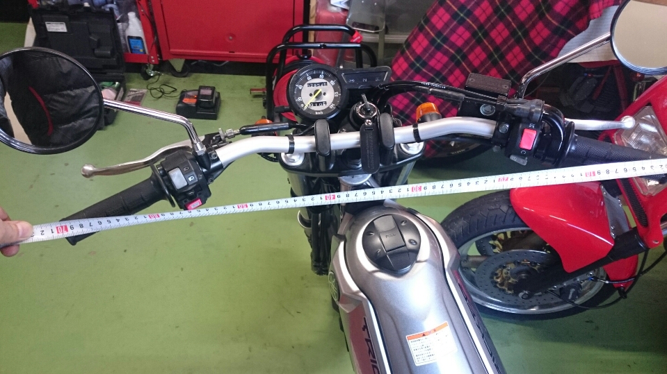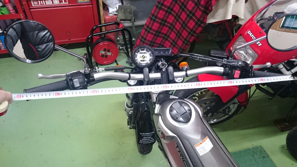 日常 2016/03/15 トリッカー・・・・・その後 こんにちは('ω')ノ CEOです。トリッカーを入手してから、1ヵ月が過ぎました。入手時はそれなりに満足はしていたのですが、徐々に気に入らない部分が出てきたんですねぇ.....そんなことでありますので、手を加えることになりました( ;∀;)まずは、ハンドル。あまりにも幅が広すぎます。 780mmもあります.....自分としては、広すぎるハンドルは乗りにくくて仕方がないのです.....したがいまして、当然のように交換致します。 入手したのはPOSHのスーパーローバー。上が外したノーマルハンドル、下がPOSHハンドル。幅が全然違いますね('ω') で、取り付けるとこうなります。ちょうど700mm幅。乗った感じはかなり短くなりまして、いい感じになりました。因みに、簡単には付きませんよ。ハンドル右側にアクセルとスタータースイッチの位置決め穴を開けないといけません。スチールハンドルだと穴あけに苦労するので、今回はアルミハンドルにしました。アルミなので、電ドルで簡単に開きました。次は、フロント廻り。トリッカーはフロントフォークの可動部分がロードモデルのようにむき出し,,,,,ところが、兄弟車のセローにはフォークブーツが付いている!これは利用するしかない!ということで、ヤマハのホームページからパーツ検索してお取り寄せ(^^♪ 早速、取り付けにかかります。 ノーマル状態です。 バラし中。 取り付け完了。なんか、雰囲気が変わりますね(*´ω`)いい感じです!まだ続きます!トリッカーのライトって、非常にコンパクトなんですけどイマイチ暗いんですよねぇ。よって、バルブをお約束のLEDに交換します! ネットショップで入手の激安品。ポン付けできるH4LEDです。 LED付ける前はこんな感じでしたが、 LED付けたら青白く輝く目立つライトに!思った以上に効果絶大でした(=゚ω゚)ノこれで省電力にもなりますなぁ。さて、締めくくりはテール廻りです。我が家に来たとき、すでにセンターアップマフラーが入っていました。まぁ、これが気に入ってXJRと入れ替えたのも一つの理由でしたけど、このマフラーのおかげでテール廻りがオフ車らしからぬ、ケツ下がり状態なんですよ,,,,, 画像では分かりにくいですが、段々と納得いかなくなり、 ノーマルリヤフェンダーを入手!下の画像はリヤフェンダーの内側に入る補強パーツ?ですかね。これがないと上手く収まらないというか、走ると振動でフェンダー取り付けボルトが緩みやすくなるようです。(現実に走行中、ボルトを落としました,,,,,) せっかくなので、前後のウインカーもノーマルに戻すべくパーツ入手!当然のことなのですが、ノーマルフェンダーに戻すとセンターアップマフラーは取り付けできなくなります(爆)ここまできたら勢いに任せてマフラーも変えちゃうぞーーーーーーー!! やっちゃいました,,,,,(;'∀')DELTA バトル4 スリップオンサイレンサー入れました,,,,,カッコいいです,,,,,,,,,,,,,,,,,,,,,サウンドは?静かなはずはありません ※注(爆音ではないです、バッフル抜いてませんので,,,,,)マフラーも付きましたので、リヤフェンダー、ウインカーを組んでいきます。 トリッカーはノーマルフェンダーがあいますねぇ(自己満足ですが) フロントウインカーもノーマル戻し。元々付いていたセロー用純正ウインカーも捨てがたいところはありましたが、やっぱりノーマルのほうが納まりがいいので、良し!とします。そして完成の図!!! バランスが良くなりました、リヤ廻りがしっかりとケツ上がりになってます(@^^)/~~~オフ車はこうでないと。あと足りないところはフロントのアップフェンダーなんですが、どうしましょうねぇ,,,,,しかし、250ccのオフ車って初めて所有しますが、 使い切れるパワーで車両重量も非常に軽い!(車種にもよりますがね)これ、結構面白いですよ(^o^)丿 にほんブログ村[12回]PR