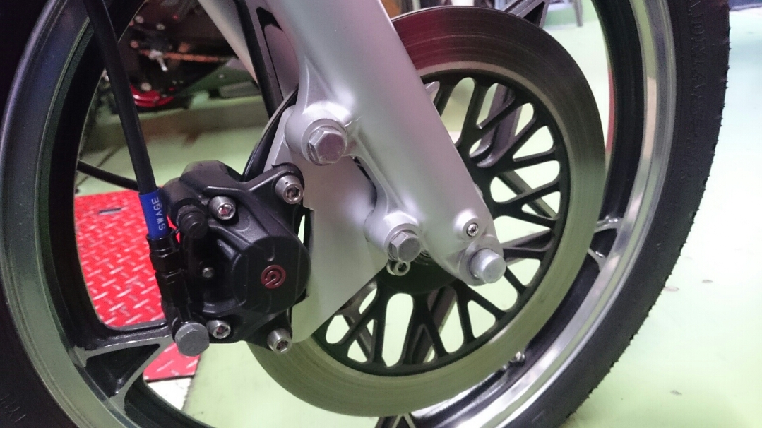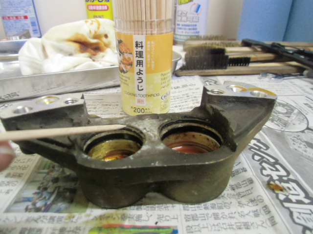 日常 2017/03/08 ガンマ F回りメンテ 其の1 こんにちは!マッシーです。只今、メンテナンス中のガンマ今はフロント回りを中心にメンテしております。これからしばらくは、貯め込んでいた写真をUPしていきます。 今現在もF回りバラバラの状態のガンマ今日はブレーキキャリパー編を書きます。 アクリル系塗料(自塗)で塗られていたキャリパー剥離して綺麗になればいいケド・・・・(-_-;) ピストンは当然固着!けど思ったよりヒストン表面の腐食は大丈夫そう? 廃材の純正ブレーキホースを取付、ホースにエアーを送り込みピストンを押し出す作戦!なるべく均一に押し出す為、木材などを入れ調整しましたが なかなか上手くいきませんでした (-_-;) トキコ製のキャリパーは、補修部品が全部でましたので迷わず割ります。 専用工具でピストンを引き抜きます! ピストンを外し中を確認すると、かなりゲロゲロな状態!頑張って磨きます!(=゚ω゚)ノ 料理用ようじで、キャリパーシールを取り外します。つまようじより丈夫です!木材なので表面に傷を付けずに取り外しが出来ます。又、シールの溝も気を使わずカリカリと汚れを削り落とせます。(=゚ω゚)ノ その他ケミカルなどを使い何とかここまで、頑張って綺麗にしました(=゚ω゚)ノ 表面の塗料は、歯ブラシにアクリル系溶剤を付け塗装を剥がします。 外したシール ブヨブヨしておらず再利用出来そうな感じですが、当然ながら新品に交換します。 普通の人が見ればただの輪っかのゴム?にしか見えない物がそれなりの値段します。(-_-;) シールに専用グリース(ヤマハ製)を塗り取付ます。 ピストンも思っていた以上に状態も良く、軽く磨く程度で綺麗になりました。ピストンの表面にもグリースを塗りはめ込んでいきます。 取付ボルトはホームセンターで購入した鉄黒ボルト1本 何十円でした。念の為ボルト仕様・強度も確認しました。多分大丈夫だと思いますが、すぐサビそうな気配・・・・(-_-;) 剥離したキャリパーの表面に、邪道ですが・・・・「ドライタイプのスプレーシリコングリース」を吹きかけるとツヤツヤした表面になりました。あまりおススメではないやり方ですが、とりあえずこれで様子をみます(-_-;) 外したブレーキパッド残量はありますが、漏れたフォークオイルを吸ってる感じなので コストパフォーマンスで評判の「プロジェクトμ」のエコスポーツブレーキパッドに交換しました! 純正ブレーキマスターシリンダー見た目は綺麗ですが、純正品を揃えO/Hするよりも・・・・ ASSY交換の方が安上がり?と思うのでデイトナ製を購入! 新しいブレーキパッドを取付 キャリパーO/H終了 (=゚ω゚)ノ今回人生初のダブルディスク車を所有した私同じパーツが2個あると、手間もパーツ代も2倍かかります(-_-;) にほんブログ村[4回]