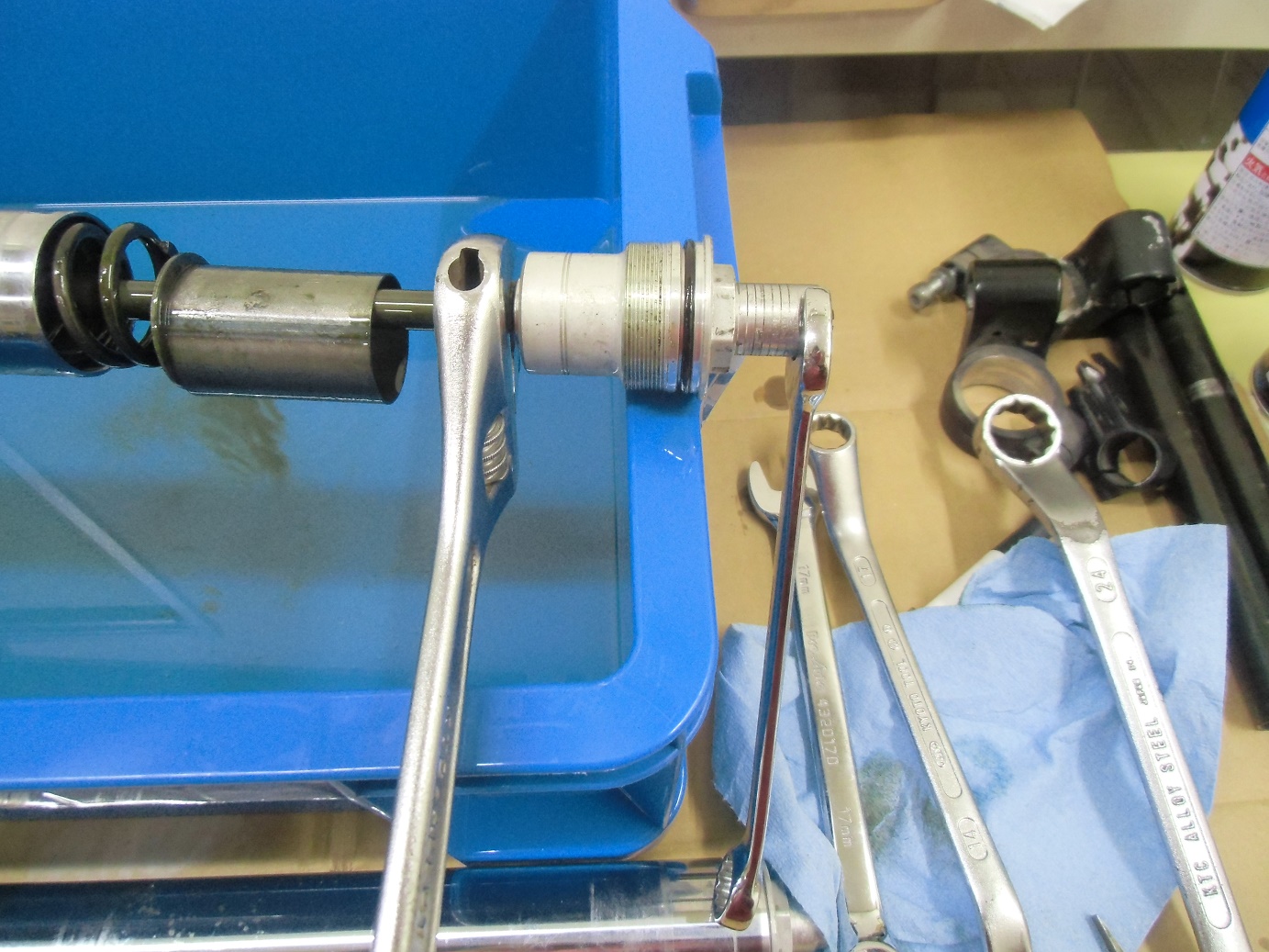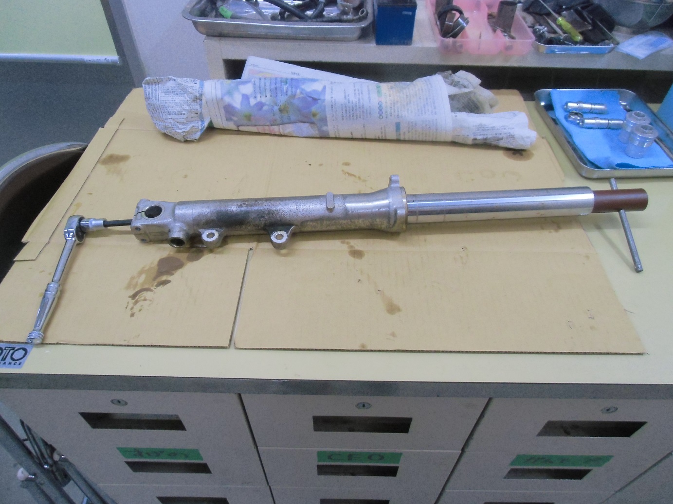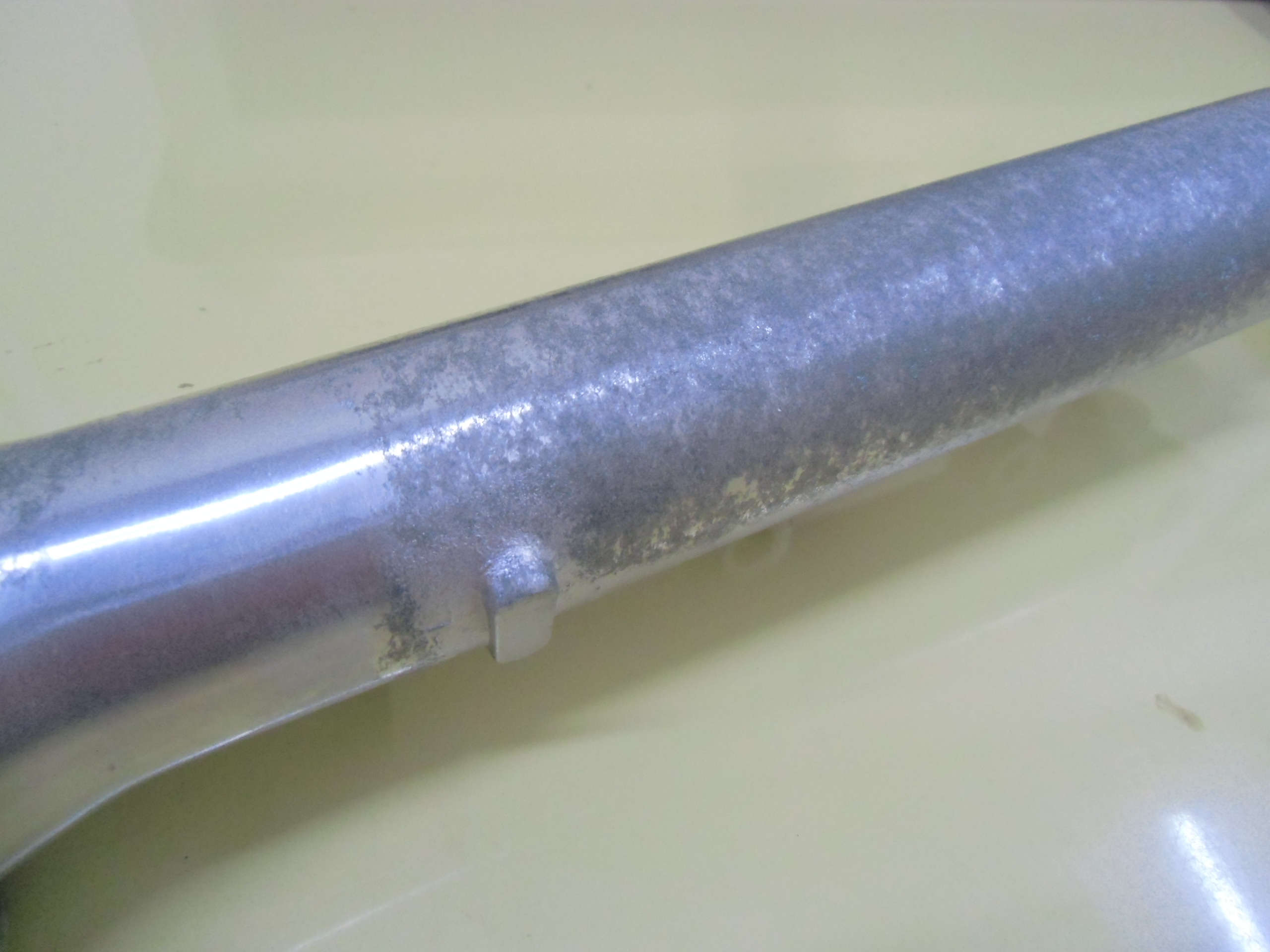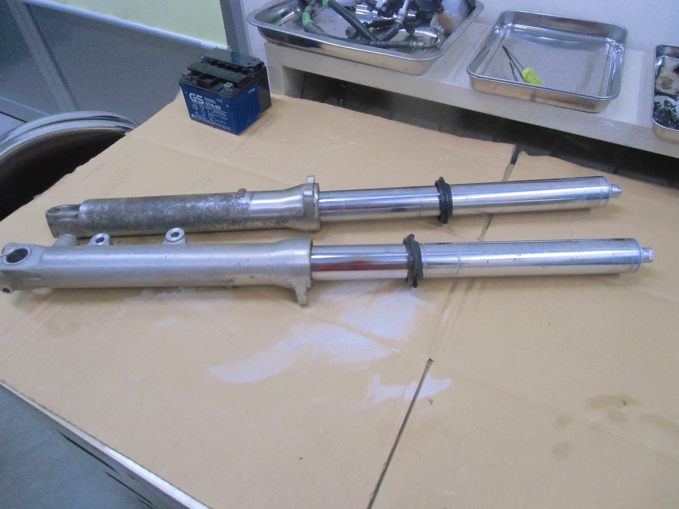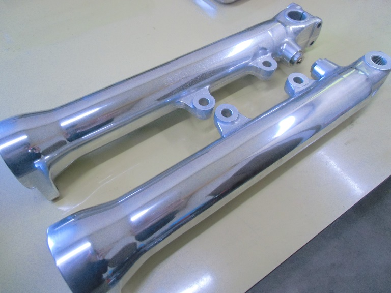 日常 2017/03/10 ガンマ F回りメンテ 其の3 こんにちは!マッシーです。今日は、フロントフォーク編を書きます。 ガンマを引き上げに行った段階からダストシールはこんな状態 (;゚Д゚) インナーチューブも点サビが酷く、 爪で引っ掛かる位の箇所もあり当然ながらフォークオイルが漏れアウターチューブはこの有り様 (;゚Д゚)ま~どんな状態であれ、O/Hはしないといけないのですがなるべくお金をかけずに、けどかけるところはキッチリかけないといけないので、まずはバラシから始めます。(=゚ω゚)ノ トップキャップ緩めオイルを抜きます。以外に綺麗なオイルが出てきました。 トップキャップをばらし、スプリング等を抜き取ります。 SP仕様のフォークの為、通常とは違う特殊工具が無いとインナーロッドが外せなく、又特殊工具を買うお金を浮かす為塩ビパイプにて自作で作りました(=゚ω゚)ノ 上の写真は、インナーロッド 共回りするので・・・・ コの字溝に特殊工具を取付インナーロッドが回らないようにします。 下部の六角ネジを外します。 フォークの中はこんな仕組みになっています。何とか上手く外せました(=゚ω゚)ノ 純正パーツを外した順に並べ、各部チェック再利用可・不可を確認します。 今回O/Hに使う純正パーツ 欠品無し!全て出ました。流石スズキ!助かりますヽ(^。^)ノ アウターチューブは、剥離剤でクリア塗装を剥がします。 オイル汚れも一緒に取れ綺麗になりましたが、 アルミ腐食が酷いので・・・・・ ガムテープで穴の箇所をマスキングし 知人の所へ持って行きガラスビーズにてブラストをしてもらいました。その後は、忍耐あるのみの (-_-;)サンドペーパーによる「手バフ」を実施!最後にマザーズを使いポリッシュ! いい感じに仕上がりました(=゚ω゚)ノ トップキャップもバフ掛けしました。この作業する前に、インナーチューブは再利用不可 (-_-;) なので、再メッキする為、「株東洋硬化」様へ送りました。納期は3~4週間ほどかかる予定そしてついに明日自宅に届きますヽ(^。^)ノこのつづきは後日・・・・明日は、東日本大震災から6年となります。今こうして普通にバイクに乗りバイクをいじり楽しめる日に改めて感謝いつまでもみんなが楽しめる日々が、送れるよう願いたいです。 にほんブログ村[1回]PR