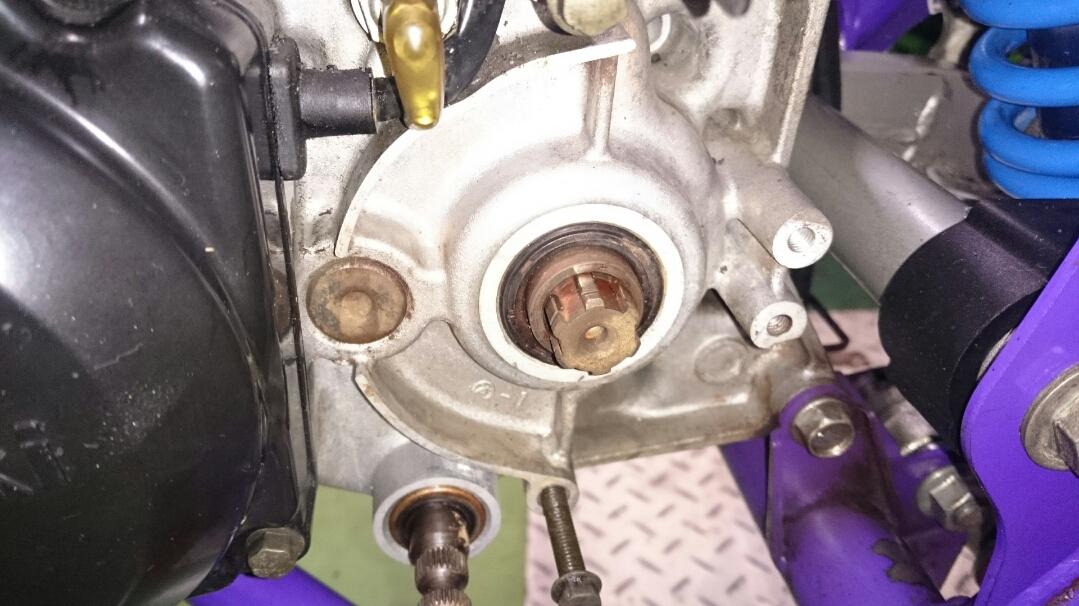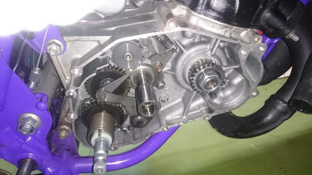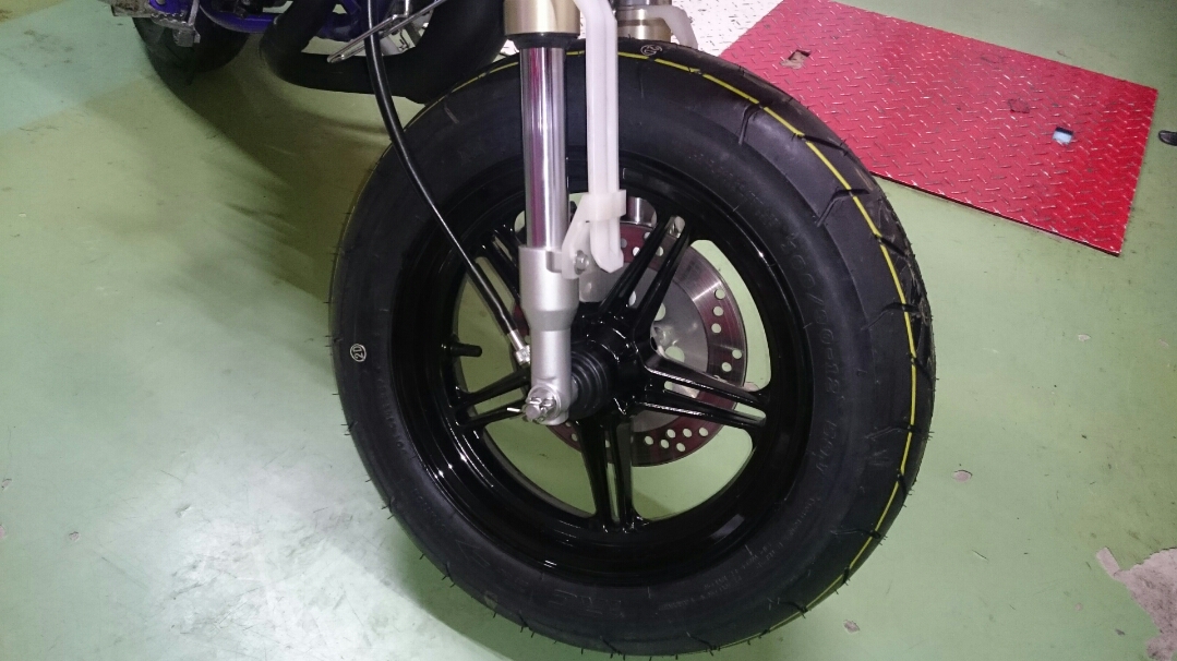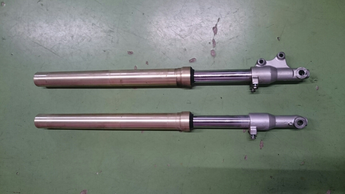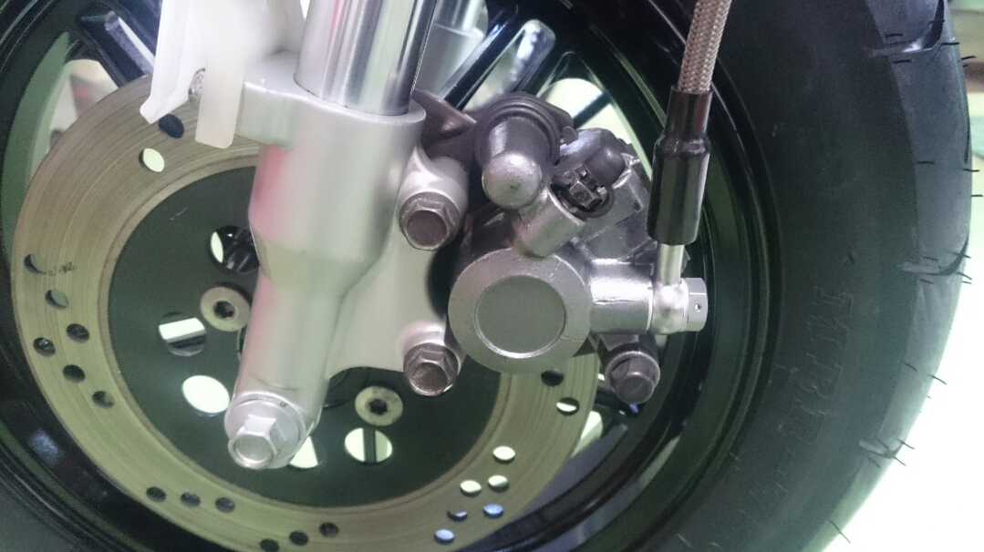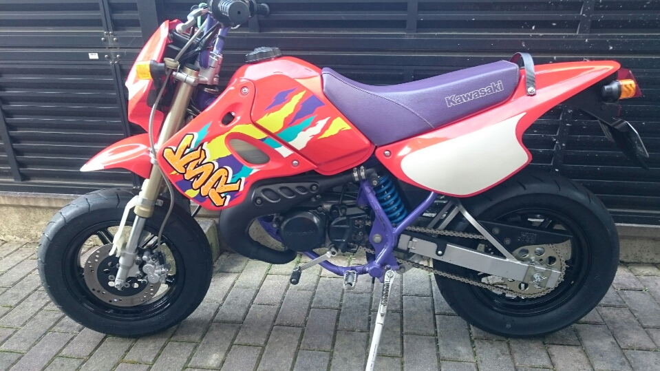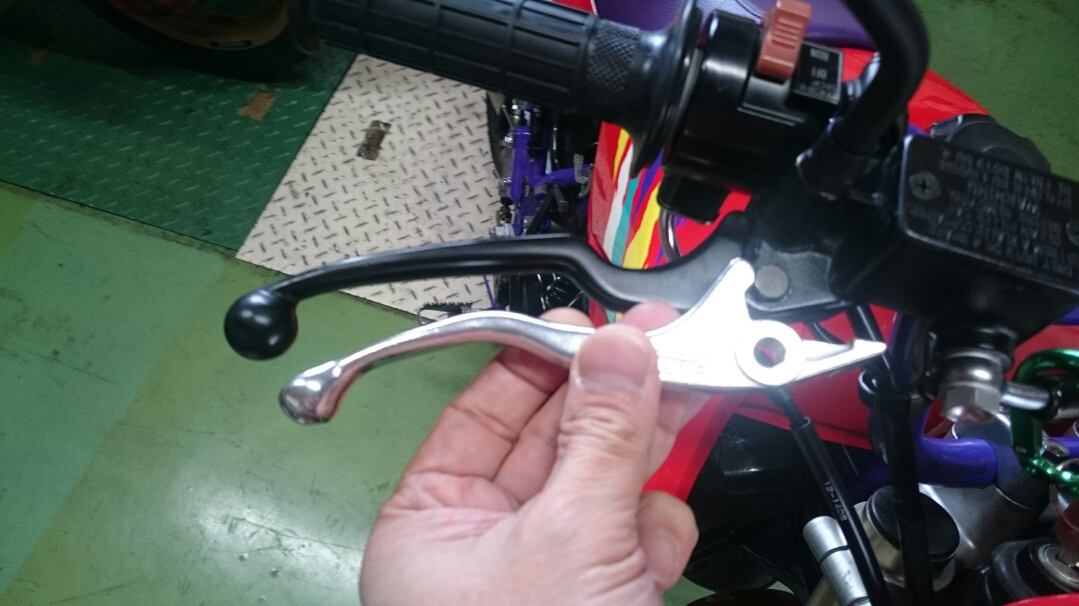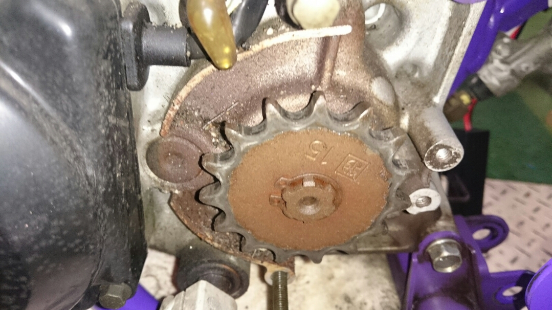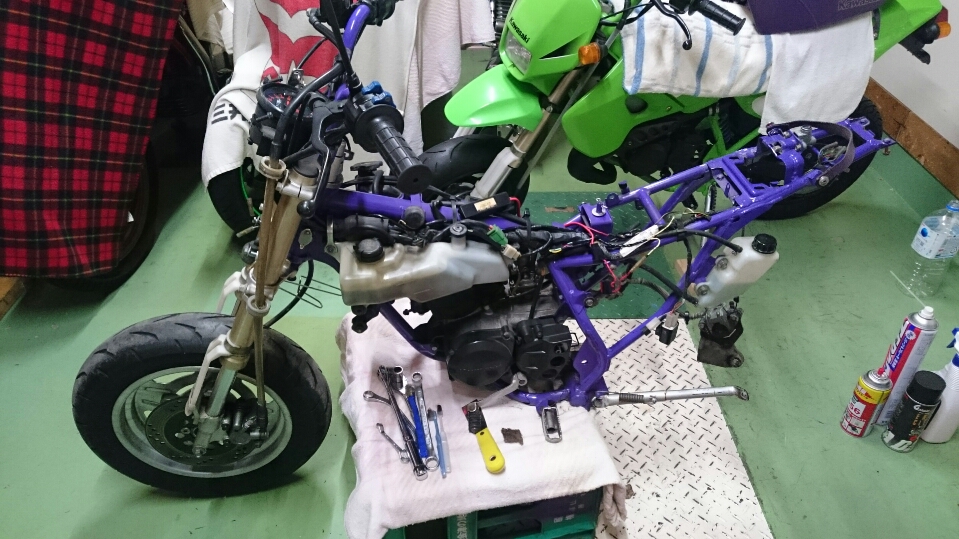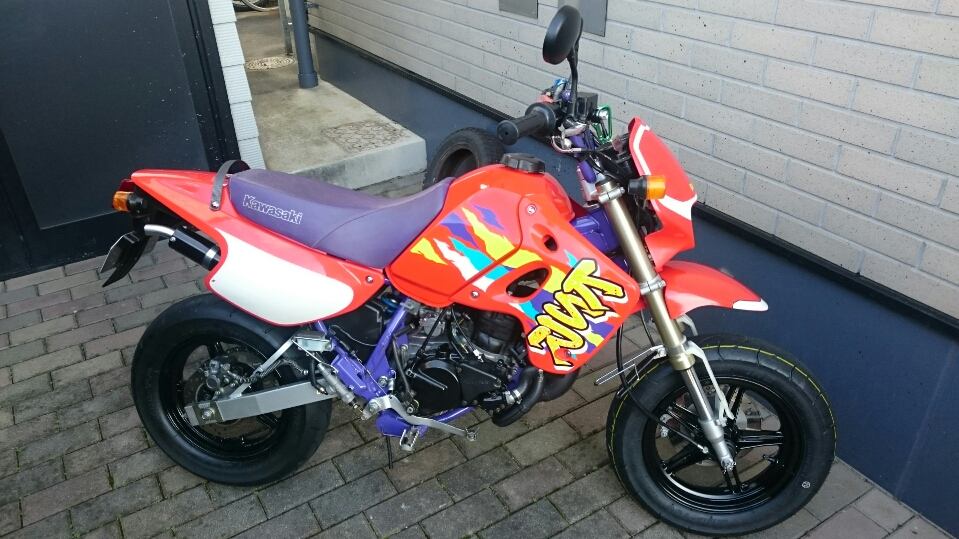 日常 2016/11/05 Kawasaki KSRⅡ 完全復活!! こんにちは、CEOです(・ω・)ノ9月にゲットしたKSRⅡですけど、この2ヶ月の間復活させるべく色々と手を加えておりました。先ずは、とにかくきれいにしないと納得できませんので、あちこちバラしながら必死こいてシコシコしてました。とにかく、オイルと泥にまみれてやりがい?がございました(疲れた.....)。特に、エンジンの手が届かないところが酷い状態だったので、スイングアームを外して綺麗にします。 ↑↑キタネェです( 一一)で、とにかく磨いて↓↓ 見違えるほど綺麗に(*'ω'*)あと一番汚いところと言えば、ドライブスプロケットまわりなんですね。 お約束のデロデロ状態です.....しか~し、吾輩の手にかかれば、 ピカピカになりました。勿論、スプロケットはこの後新品を入れました(-ω-)/次に手を加えるのは、フロントフォーク。 よく見るとなんかオイリーなんですよ。オイルシールが抜けてキャリパーもオイルまみれ。オーバーホール決定です.....( ;∀;)パーツが揃ったので早速始めます。 車体から外して、 フォークオイル抜いて、 全バラです。 インナーパーツ組み付けの図。 はい、2本とも完成。 車体に取り付けて完了です~(*'ω'*)これである程度完成したので、お役所様に足を運びナンバー取得して参りました。早速、試乗したのですがなんかおかしい???クラッチ、滑ってます.........エンジンだけ元気よく回って加速しない~(/ω\)しかたねぇ.....今度はクラッチ修理だ.....せっかく入れたフレッシュなミッションオイルとラジエタークーラントを抜きます.....(トホホ.....) 固着したクラッチカバー外すのに時間がかかりまして、途中の画像はございません。へばりついたガスケット除去にもえらく時間がかかりました.....さて、新品のクラッチプレート、フリクションプレート、クラッチスプリングを組んでいきますが、このKSRⅡのクラッチ滑りの元凶はクラッチスプリングに原因があるようです。したがって、ノーマルスプリングにプラス、強化スプリング(モトクロッサー KX80用)を組んでいきます。 左がヘタった今までのスプリング、真ん中が新品ノーマルスプリング右がKX80用強化スプリング。左のスプリングがヘタっているのが良く解りますね、真ん中のノーマルスプリングと長さが明らかに違います。右の強化スプリングも短く見えますけど、バネレートがまるで違います。手でテンションを確かめると、硬くて実にいい感じです。これでクラッチ滑りとはおさらばですなぁ(^o^)丿 KSRⅡのクラッチにはスプリングが6個入りますので、ノーマルと強化を3個ずつ交互に入れてクラッチ強化しました。 組み込み完了の図です。このクラッチオーバーホルのおかげで、今度は滑りもなく気持ち良~く加速するようになりました(=゚ω゚)ノそれほど手を入れなくても普通に走りますよってなことでしたけど、そうは問屋が卸しませんねぇ。でもまぁ、これでバッチリでしょう!でもですね、自分はこれで満足しないんですなぁ(;^ω^)そんな訳で、カスタム第一弾~! これ、買っちゃいました。 アルミホイールです(=゚ω゚)ノだって、ノーマルホイールって鉄チンで重いしカッコ悪いし.....よって、純正流用チューンであります(なんと、エンケイ製!)。このホイール、2011年型KSR110のノーマルホイールなんですね。どこぞの高級アルミホイールの四分の一以下のお値段で買えるんです!KSRⅡにはリヤハブカップリング、両サイドのカラー、ドリブンスプロケットを交換すればポン付け出来るんです(*'ω'*)因みに、フロントホイールは完全ボルトオン!最高です。当然のようにタイヤもおニューをかまします。 タイヤと組み込みに必要なパーツ。 タイヤを組んで(最近、慣れました.....(爆))車体に組みます。ノーマルホイールとの違いを見てみましょう。 ノーマルフロントホイール KSR110フロントホイール(カチョエェ~!) ノーマルリヤホイール KSR110リヤホイール(きまってるぅ~!)リヤタイヤはサイズ(太さ)もアップしてますよ! う~ん、シブいぜ(*´ω`)まだ続きます。KSRⅡの弱点の一つに、フロントブレーキの効きが悪いことが挙げられます。 ショボイ方押し1ポットキャリパー、カッコも悪い.....問答無用で交換です! これなんですけど、リーズナブルに制動力を解決するべく、これまた純正流用であります。これもモトクロッサーKXのパーツであります。 組むとこんな感じに。これも見てくれは断然カッチョエェです(*'ω'*)肝心の効きは?少しは良くなったかなぁ.....ある程度距離を乗れば当たりが出て良くなると思います(期待しよう.....)キャリパー組むのに、ブレーキオイルのエア抜きは当然の事ですけど、その為の専用工具があるとスムーズに物事が進むのは、変態バイク野郎にはご理解頂けると思います。自分も十数年前からその工具を持ってまして、今回も使いましたが経年変化とでもいうのでしょうか、この工具がボキッ!という音とともにご臨終と相成りました。今は安いけど、当時はこの手の工具は高か