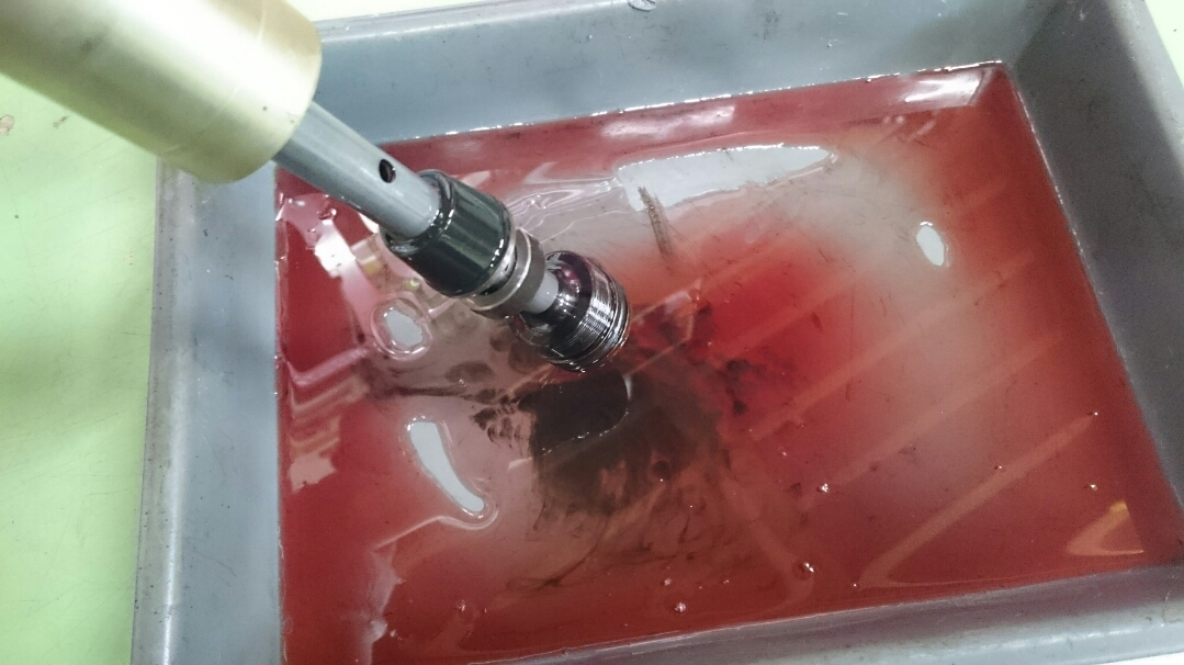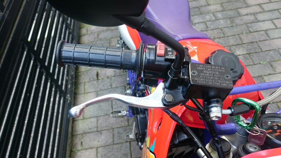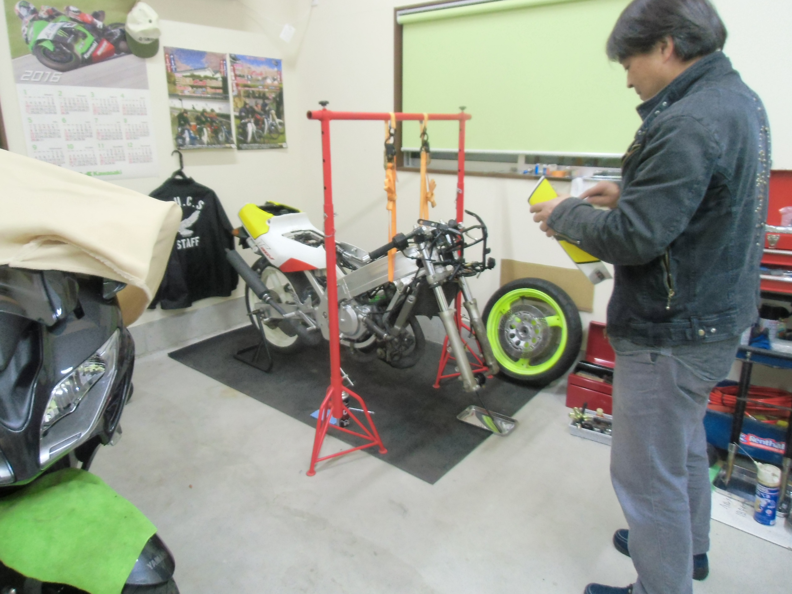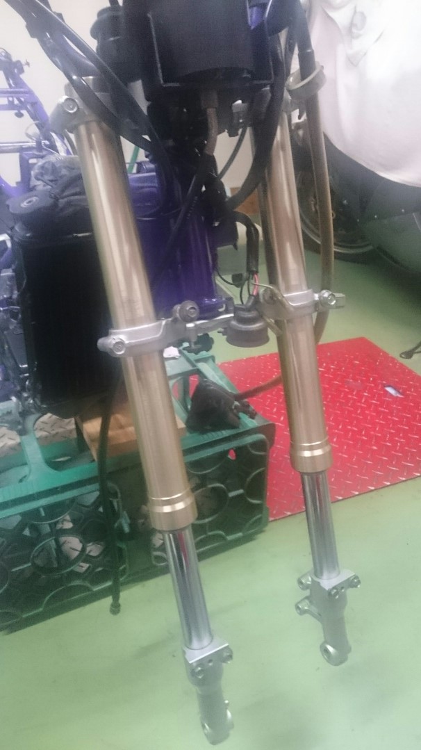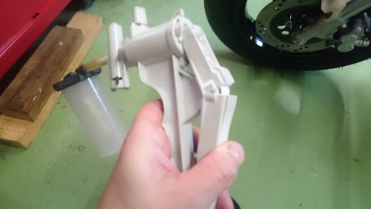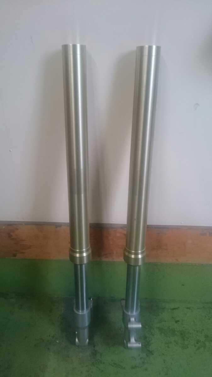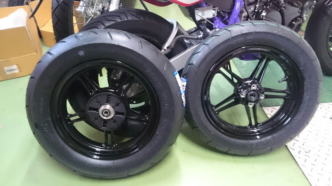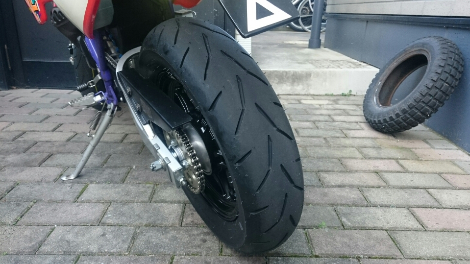 日常 2016/11/05 Kawasaki KSRⅡ 完全復活!! こんにちは、CEOです(・ω・)ノ9月にゲットしたKSRⅡですけど、この2ヶ月の間復活させるべく色々と手を加えておりました。先ずは、とにかくきれいにしないと納得できませんので、あちこちバラしながら必死こいてシコシコしてました。とにかく、オイルと泥にまみれてやりがい?がございました(疲れた.....)。特に、エンジンの手が届かないところが酷い状態だったので、スイングアームを外して綺麗にします。 ↑↑キタネェです( 一一)で、とにかく磨いて↓↓ 見違えるほど綺麗に(*'ω'*)あと一番汚いところと言えば、ドライブスプロケットまわりなんですね。 お約束のデロデロ状態です.....しか~し、吾輩の手にかかれば、 ピカピカになりました。勿論、スプロケットはこの後新品を入れました(-ω-)/次に手を加えるのは、フロントフォーク。 よく見るとなんかオイリーなんですよ。オイルシールが抜けてキャリパーもオイルまみれ。オーバーホール決定です.....( ;∀;)パーツが揃ったので早速始めます。 車体から外して、 フォークオイル抜いて、 全バラです。 インナーパーツ組み付けの図。 はい、2本とも完成。 車体に取り付けて完了です~(*'ω'*)これである程度完成したので、お役所様に足を運びナンバー取得して参りました。早速、試乗したのですがなんかおかしい???クラッチ、滑ってます.........エンジンだけ元気よく回って加速しない~(/ω\)しかたねぇ.....今度はクラッチ修理だ.....せっかく入れたフレッシュなミッションオイルとラジエタークーラントを抜きます.....(トホホ.....) 固着したクラッチカバー外すのに時間がかかりまして、途中の画像はございません。へばりついたガスケット除去にもえらく時間がかかりました.....さて、新品のクラッチプレート、フリクションプレート、クラッチスプリングを組んでいきますが、このKSRⅡのクラッチ滑りの元凶はクラッチスプリングに原因があるようです。したがって、ノーマルスプリングにプラス、強化スプリング(モトクロッサー KX80用)を組んでいきます。 左がヘタった今までのスプリング、真ん中が新品ノーマルスプリング右がKX80用強化スプリング。左のスプリングがヘタっているのが良く解りますね、真ん中のノーマルスプリングと長さが明らかに違います。右の強化スプリングも短く見えますけど、バネレートがまるで違います。手でテンションを確かめると、硬くて実にいい感じです。これでクラッチ滑りとはおさらばですなぁ(^o^)丿 KSRⅡのクラッチにはスプリングが6個入りますので、ノーマルと強化を3個ずつ交互に入れてクラッチ強化しました。 組み込み完了の図です。このクラッチオーバーホルのおかげで、今度は滑りもなく気持ち良~く加速するようになりました(=゚ω゚)ノそれほど手を入れなくても普通に走りますよってなことでしたけど、そうは問屋が卸しませんねぇ。でもまぁ、これでバッチリでしょう!でもですね、自分はこれで満足しないんですなぁ(;^ω^)そんな訳で、カスタム第一弾~! これ、買っちゃいました。 アルミホイールです(=゚ω゚)ノだって、ノーマルホイールって鉄チンで重いしカッコ悪いし.....よって、純正流用チューンであります(なんと、エンケイ製!)。このホイール、2011年型KSR110のノーマルホイールなんですね。どこぞの高級アルミホイールの四分の一以下のお値段で買えるんです!KSRⅡにはリヤハブカップリング、両サイドのカラー、ドリブンスプロケットを交換すればポン付け出来るんです(*'ω'*)因みに、フロントホイールは完全ボルトオン!最高です。当然のようにタイヤもおニューをかまします。 タイヤと組み込みに必要なパーツ。 タイヤを組んで(最近、慣れました.....(爆))車体に組みます。ノーマルホイールとの違いを見てみましょう。 ノーマルフロントホイール KSR110フロントホイール(カチョエェ~!) ノーマルリヤホイール KSR110リヤホイール(きまってるぅ~!)リヤタイヤはサイズ(太さ)もアップしてますよ! う~ん、シブいぜ(*´ω`)まだ続きます。KSRⅡの弱点の一つに、フロントブレーキの効きが悪いことが挙げられます。 ショボイ方押し1ポットキャリパー、カッコも悪い.....問答無用で交換です! これなんですけど、リーズナブルに制動力を解決するべく、これまた純正流用であります。これもモトクロッサーKXのパーツであります。 組むとこんな感じに。これも見てくれは断然カッチョエェです(*'ω'*)肝心の効きは?少しは良くなったかなぁ.....ある程度距離を乗れば当たりが出て良くなると思います(期待しよう.....)キャリパー組むのに、ブレーキオイルのエア抜きは当然の事ですけど、その為の専用工具があるとスムーズに物事が進むのは、変態バイク野郎にはご理解頂けると思います。自分も十数年前からその工具を持ってまして、今回も使いましたが経年変化とでもいうのでしょうか、この工具がボキッ!という音とともにご臨終と相成りました。今は安いけど、当時はこの手の工具は高か