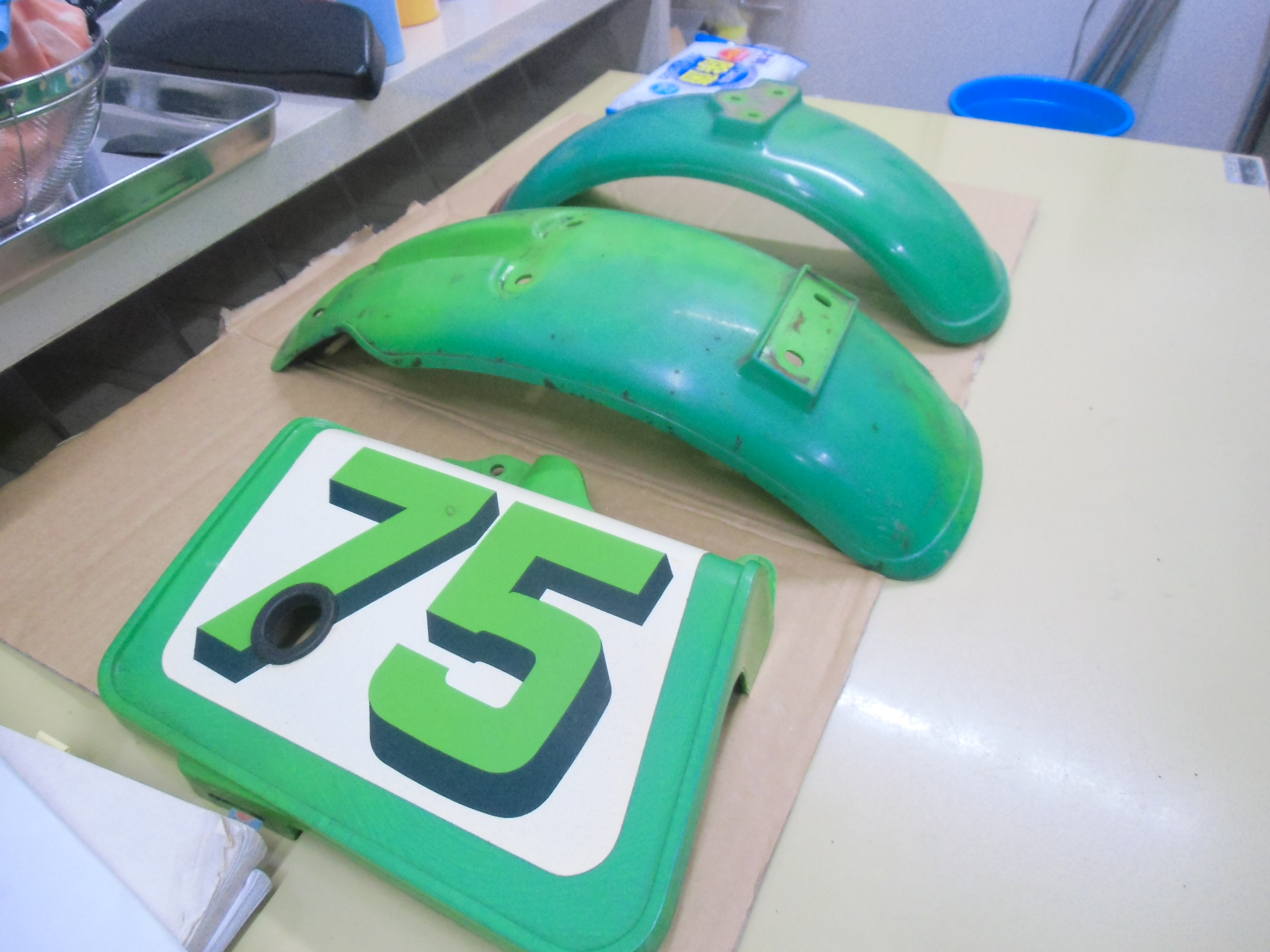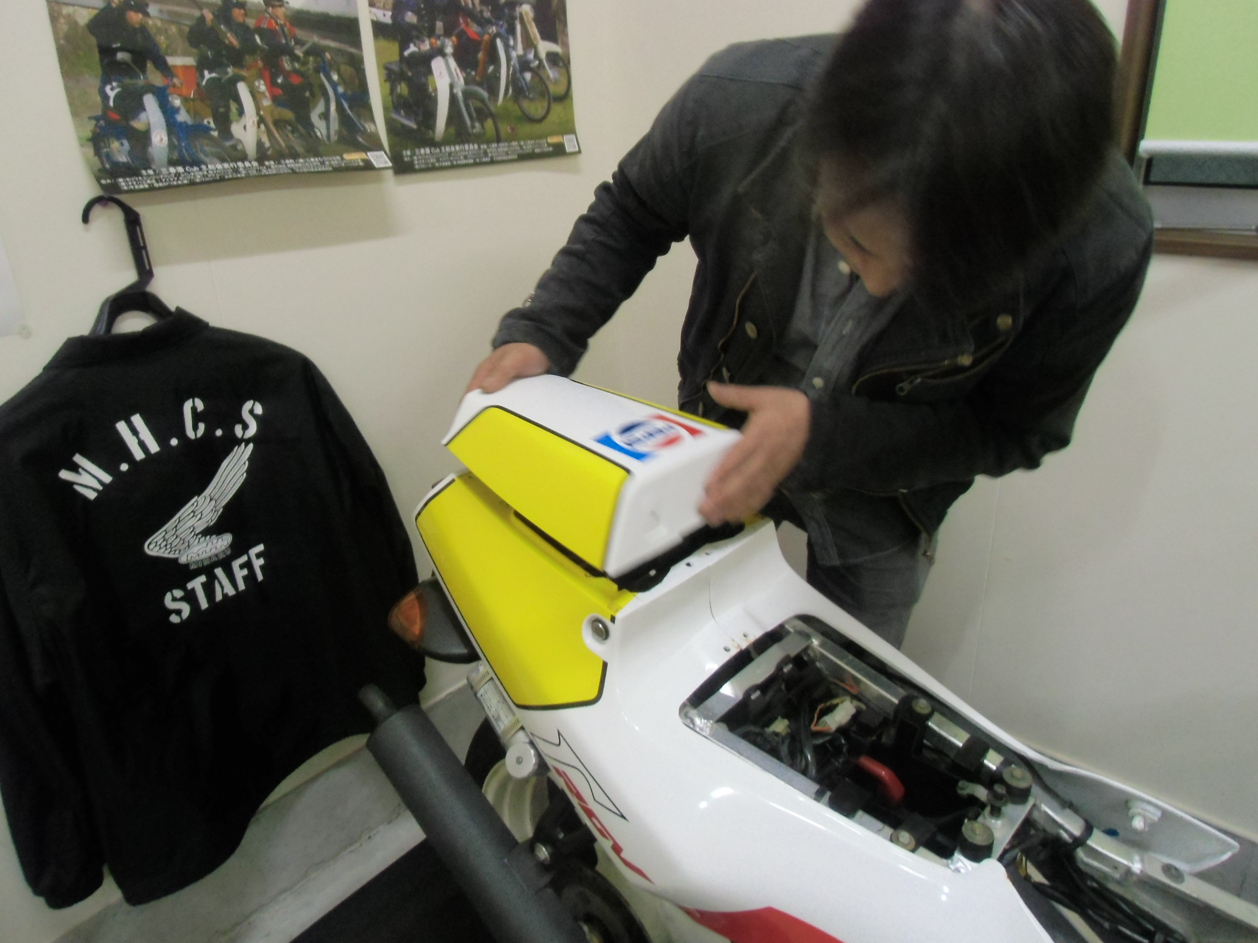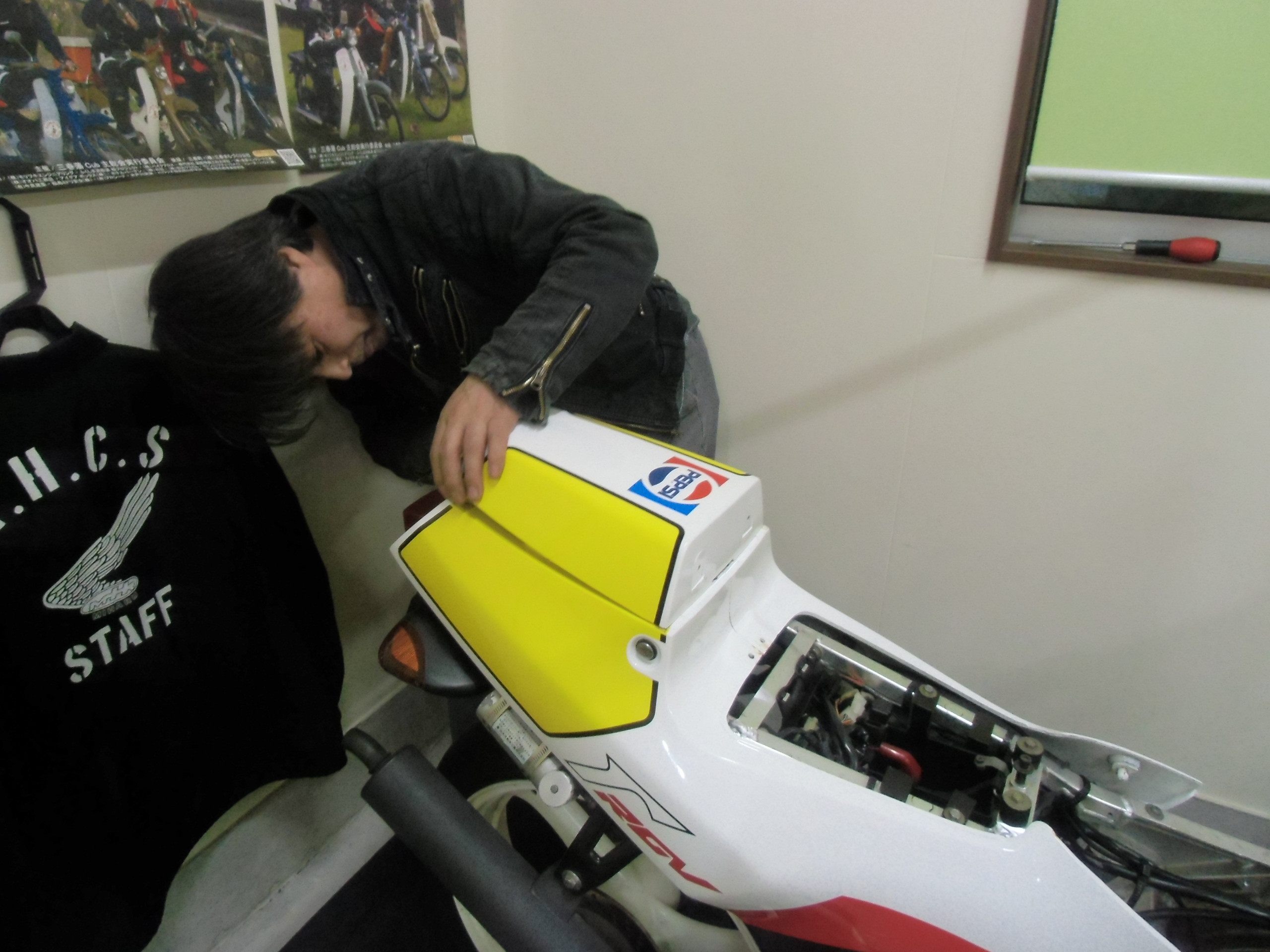 日常 2017/01/17 その道の方々・・・其の③ 新年あけましておめでとうございます。ようやく「後厄」から解放されたマッシーです。来年もいい年になるよう!ガツガツいきますよ(゚Д゚)ノ今回は昔からの知人にガンマのカウル補修を依頼した事を書きます。 シングルシートカウル(表) (裏面)パッと見は特に目立った割れ・キズ等は無さそうに見えますが・・・ よーく見てみると・・・割れています。(-_-;) ステーを外すと新たな割れを発見!しかももう1つのステーも同じく割れておりました。(-_-;) シートカウル(表) シートカウル(裏) シートカウルを外した瞬間!グロメットに差し込む部分が根元から折れてしまいました ( ゚Д゚)特にひどい割れ・欠けが無いので「瞬間接着剤で直るるだろう!」と簡単に思っていましたが、「やはり!しっかり直したい!」ならばあの人しかいない! ( ゚Д゚)その昔、以前乗っていたSR400のサイドカバーを希望通りのデザインでFRP「ワンオフ」製作していただいた知人の「工藤さん」とにかくFRP制作に関しては「スゴ腕」の持ち主であります。数年ぶりに電話して補修依頼しました。私「すみません!ガンマの純正カウルが割れているので、FRPで直して 欲しいのですが・・・」工藤さん「純正のカウルですよね?」私「そうですよ!」工藤さん「プラスチックにFRP素材は付きませんよ!」私「へっ?( ゚Д゚)」 知りませんでした・・・勝手にプラスチックイコールFRPと思い込んでいた私・・・改めて割れた箇所を、工藤さんに確認していただき「補修可能なので持ち帰ります!」と補修を引き受けてくれました。(#^.^#)しばらくして、工藤さんから私の携帯に写真が送られてきました。 タミヤの「プラ棒」を使って補修します。 炙って?プラ棒を曲げる 取れた部品の外側と同じ曲がりになるよう、さらに形を整えます。 プラスチック専用接着剤を使って取り付けます。続いてシートカウルステーの補修 元のステーを残し、新たに同じ形のステーをもう1枚作ります。 何とも細かい作業です。私には不向きな作業です・・・(-_-;) 専用接着剤を付け「洗濯バサミ」でしっかり圧着! 完成!(゚Д゚)ノ しかも新たなステーを取付ていただき補強してくれました。(゚Д゚)ノ後日 ここでようやくブログに「工藤さん」登場!補修終えたカウル類をガレージまで届けに来てくれました。早速フィッティング開始!シートカウルは問題なく取付ける事が出来、補修した部分の強度もバッチリ!これで「おそるおそる」外す必要なし(=゚ω゚)ノ しかし、シングルシートは、イマイチしっくりきません。隙間やガタもあるし・・・・(-_-;) 工藤さんがボルトを緩め前後ステー位置を調整します。調整した位置に線を引き目印とします。 付けては、外し、ステー位置調整を繰り返すこと数十回・・・・・ ようやく取り付け、取り外しに対して問題なく出来ました。ヽ(^。^)ノ強度もバッチリです。作業していただいた工藤さんから「一言・・・」「80年代は、そんなもん!ですよ!」まー確かに今から約28年前の物ですし・・・・(-_-;)本体のゆがみ・劣化もあるし・・・・(-_-;)現行車とは、造りも材質も進化していますし・・・・(-_-;)大変忙しい中、カウル補修していただきありがとうございました。ヽ(^。^)ノとても色々な勉強をさせていただきました。そして・・・・ここからが工藤さんの本領発揮! 知人のKV75 F・Rフェンダーとゼッケン後日、FRPにて純正と同じ形にワンオフ製作してもらいます(゚Д゚)ノ出来次第ブログアップいたします。 ガリ傷が痛々しいアンダーカウルこちらもステッカー補修依頼中です。「その道の方々・・・其の④」で出来次第アップいたします。今年もどーぞホテルバーデンブログにお付き合いください (*ノωノ) にほんブログ村[9回]