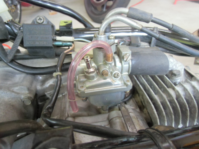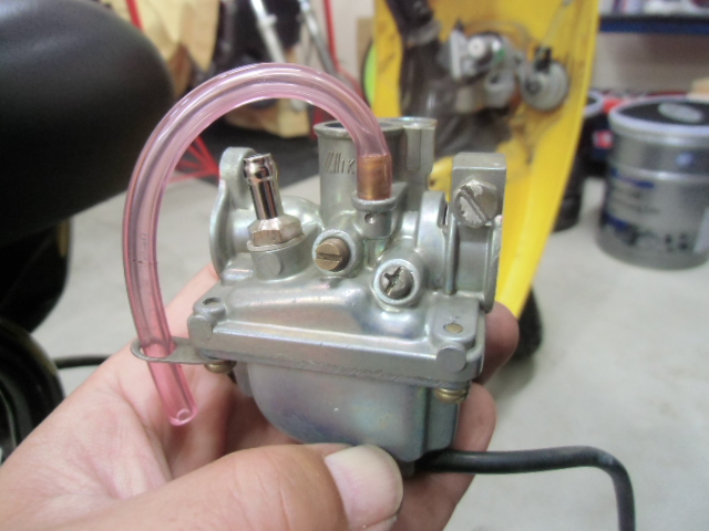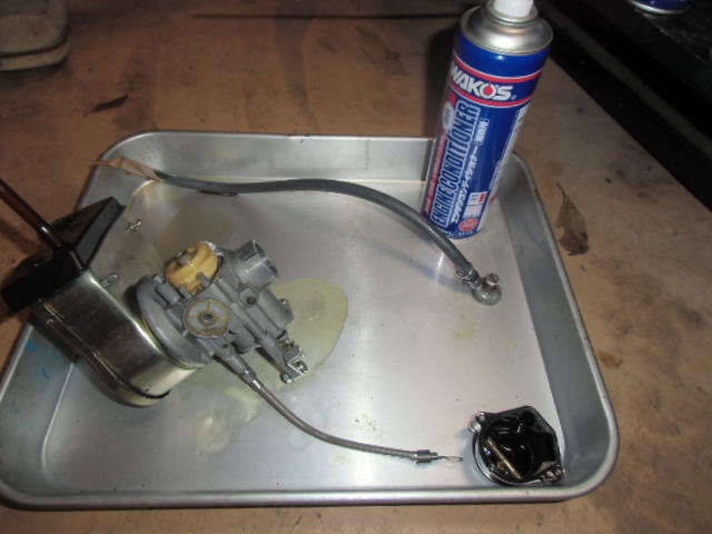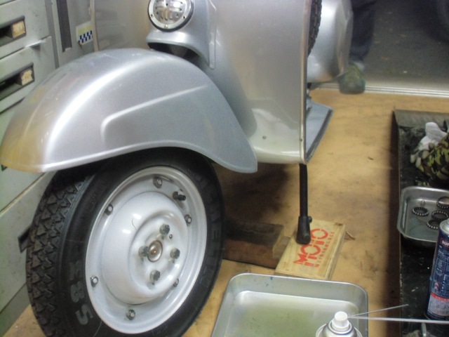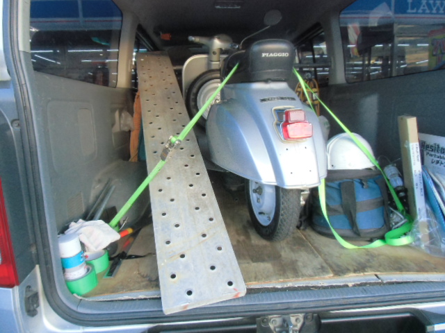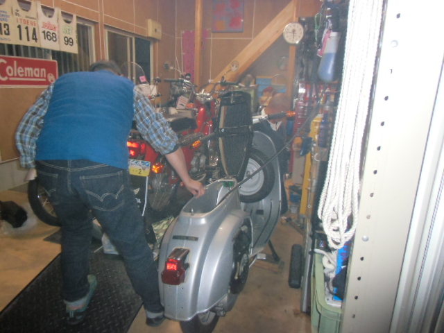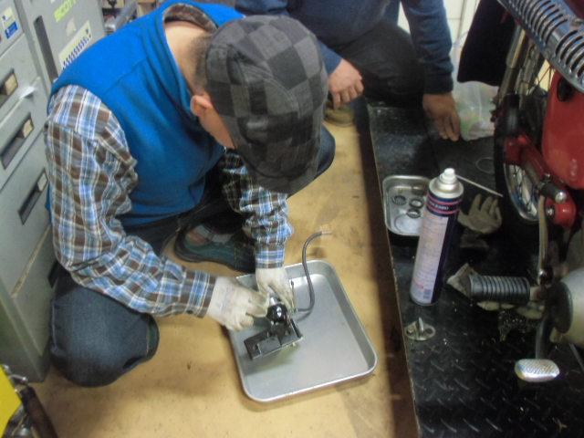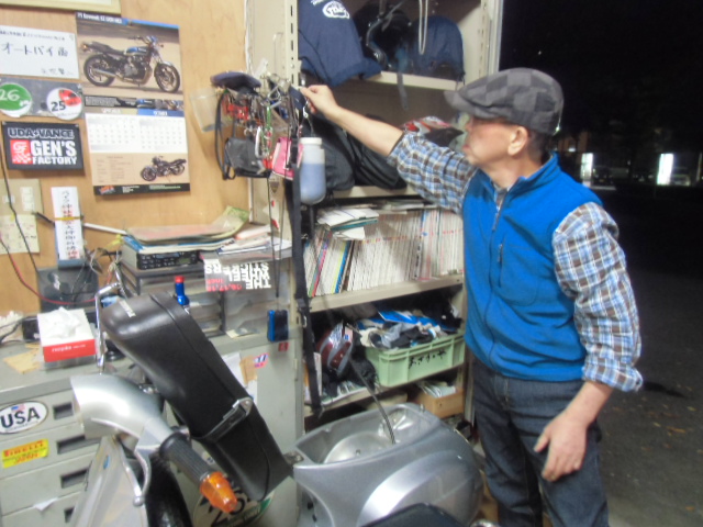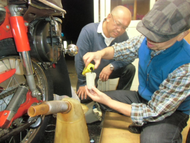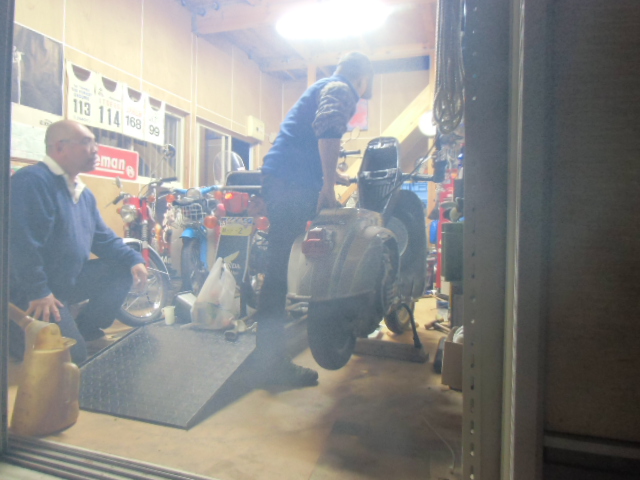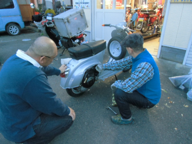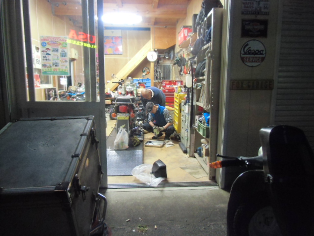 日常 2016/10/26 その道の方々・・・其の② こんにちは!マッシーです。前回の続き・・・グリーンワールドを後にし、一旦自宅へ帰りました。その日の午後16:00に知人と一緒にバイクを積んだ車に乗り込み 向かった先は・・・・須賀川市にある手作りパンの店「ベスパン」 到着時刻17:00 写真のベスパは、実働から約3年室内保管されていたいました。知人は以前から「ベスパ」を探していたのですが、なかなか希望の車両が見つからずかれこれ1年位経過しておりました。そんな中、私のバイク仲間を通じて極上のベスパを格安で売るとの情報をいただき無事商談成立!念願のベスパオーナーとなったのですが、私もオーナーの知人も全くベスパに関しては無知の2人 (-_-;)頼れるバイク屋さんも無い為、購入前にベスパンの矢吹さんに連絡をし、購入後、色々と「お世話をお願いいたします」と保険をかけていた私 (-_-;)そんなメンドクサイ事を、快く引き受けて下さいました矢吹さんに感謝です。 (*'▽') 先ずは、プラグを外し「火花」チェック! 特に問題なし (-。-)y-゜゜゜ ガソリンタンクを外し「キャブレター」の確認 実にスピーディーな作業でキャブ本体を外し「バラシ」始めた矢吹さん! キャブ本体は特に目立った汚れは無かったのですが、 「ジェット類」は腐ったガソリン等で詰まっていました。(-_-;)ケミカルを吹き付けしばし「ドブ漬け」にしておきます。 その間、キャブ本体 各部チェック!ずっと側で、真剣に矢吹さんの作業を見つめる知人・・・(; ・`д・´) 作業開始から約30分経過・・・ すっかり外は真っ暗! 「ドブ漬け」したジェット類にケミカルを吹き付け詰まった穴を貫通させます。 キャブを取付て 専用容器で「混合ガソリン」を作り 「点滴」に混合ガソリンを入れ直接キャブに流し入れます。 キャブのチョークを引いて・・・ スタンドの下に板を置き、リアタイヤを浮かせます。 待ちに待った「火入れ式」 数回キックペダルを踏むと・・・・ エンジンが目覚めました ( ゚Д゚) 一瞬にてガレージ内は「白煙」で真っ白に・・・・(*´Д`)「とりあえずひと安心」と思った矢先・・・・ エンジンはすこぶる調子良さげですが、チョークを戻すとエンジンがストールして止まります。やはり!キチンとしたキャブ調整が必要見たいです。(-_-;)これまでの作業にかかった時間は約1時間 ( ゚Д゚) 早っ!!!!!!矢吹さん!大変お世話になりました <m(__)m>その後、矢吹さんから「ベスパ」に関する色々な情報を教えてもらい帰り間際には、矢吹さんから古いベスパのエンブレムをプレゼントされ「とても充実した時間を過ごした!」と上機嫌な知人!私も大変色々と勉強になった楽しい1日でした。近頃朝晩は冷え込む為いよいよガレージにストーブを出す季節となりました。 ついでに鍋にサビ取り剤と「錆びたガンマのパーツ」を入れ煮込みます。ガンマレストアから2年目の「冬」となります。私の「ガンマ」は何時目覚める事やら~ (-。-)y-゜゜゜ にほんブログ村[4回]PR