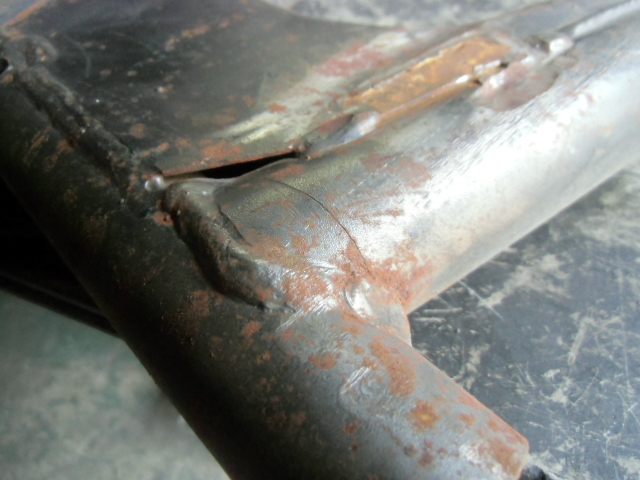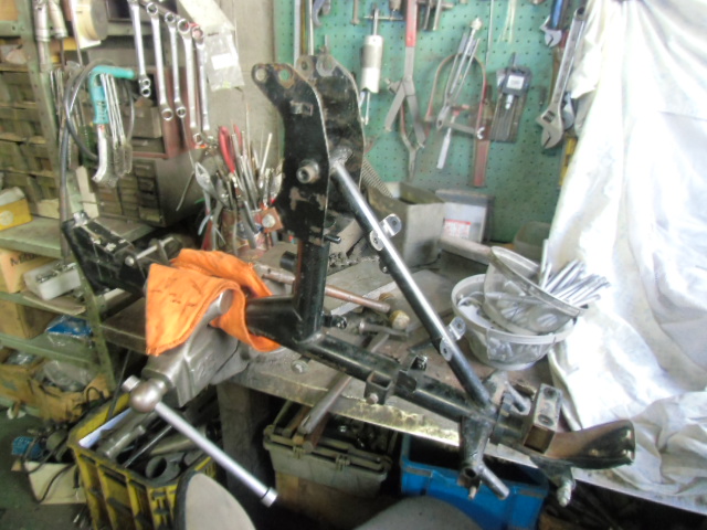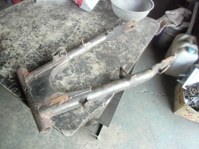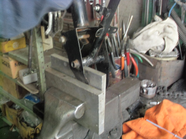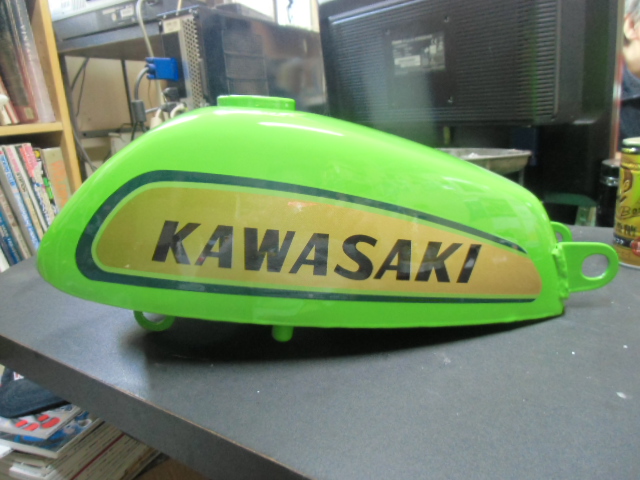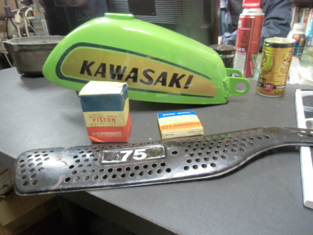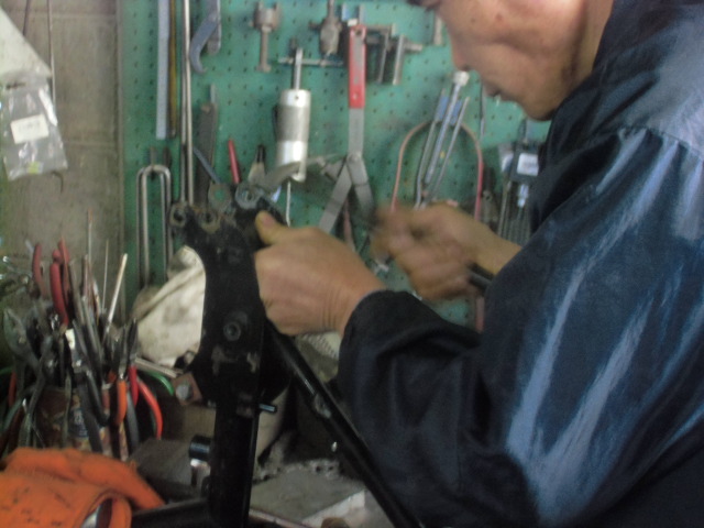 日常 2016/10/18 その道の方々・・・其の① こんにちは!マッシーです。先日、大変いつもお世話になっています「グリーンワールド」店主 大堀さんへ「ある物」を届ける為、伺ったついでに、大堀さんがレストアしてます「KV75」のフレームを「見て来てくれ!」と同じくKV75をレストアしています知人に頼まれていた私 (-_-;) ※赤色の矢印の部分を確認何でこんな所を確認する必要あるかって?・・・知人のフレームと見比べると明らかになりました。曲がっている!( ゚Д゚)それも「くの字」バリに・・・・(-_-;)どんなやり方で直せば良いか、大堀さんから色々と指導を伺っていると、「ちょっとやってみるか!」持参したフレームを手に取り修正作業に取り掛かりました。 ※赤い印の部分 万力に板を当てがり曲がりを修正していきます。 フレームをひっくり返し、 曲がっているフレームの内側に板を当て、外側から少しずつハンマーで叩き修正していきます。約15分位の作業で修正終了( ゚Д゚) すっかり元通りになったフレーム!大堀さんの作業を見ていると、本当に無駄な動きが無くかつスピーディーな作業でした。こうすれば→こうなる!あーすれば→あーなる!などなど、やはり「その道の方は・・・」と感動しっぱなしのマッシーでした。(>_<)作業終了後、珍しい物を見せてもらいました。 カワサキ Zのノーマルスイングアーム 「クラック」が入っている場所解りますか?塗装の為、サンダーでサビ・塗装を剥がしている最中に発見したそうです。これは、使い物にならないそうです。「今は簡単にブラストで剥がせるけど、ブラストをかけるとクラックが見えにくくなり発見もしづらい!」「サンダーを使い手作業で剥がすことにより、各部分の観察する時間が多くなるのでクラックや思いがけない発見などがある」と教えていただきました。<m(__)m>作業終了後、事務所で休憩中完成したKV75のガソリンタンクを見せていただきました。 おーーーーっ!美しい(*´Д`)タンクに見惚れていると・・・・「はい!これ!」と渡されたのが・・・・・ KV75 輸出仕様のマフラーガード 未使用のオーバーサイズピストンとリング「レストアしている知人にプレゼントして!」と前回に続きまたまた大変貴重な物をいただきました。( ゚Д゚) 大堀さんの所へ届けた「ある物」とはコチラ!以前大堀さんからKV75「スイッチBOXが無い」と聞いてた知人が、自分のKV75に付いてた物を、大堀さんへのお礼のプレゼントとして届けてと知人に依頼されてました。その後、KV75のレストアに関するたくさんの情報を教えていただきました。大堀さん 大変貴重な時間や部品をいただきありがとうございました。<m(__)m>次回 その道の方々・・・其の②へ続く・・・・ にほんブログ村[5回]
